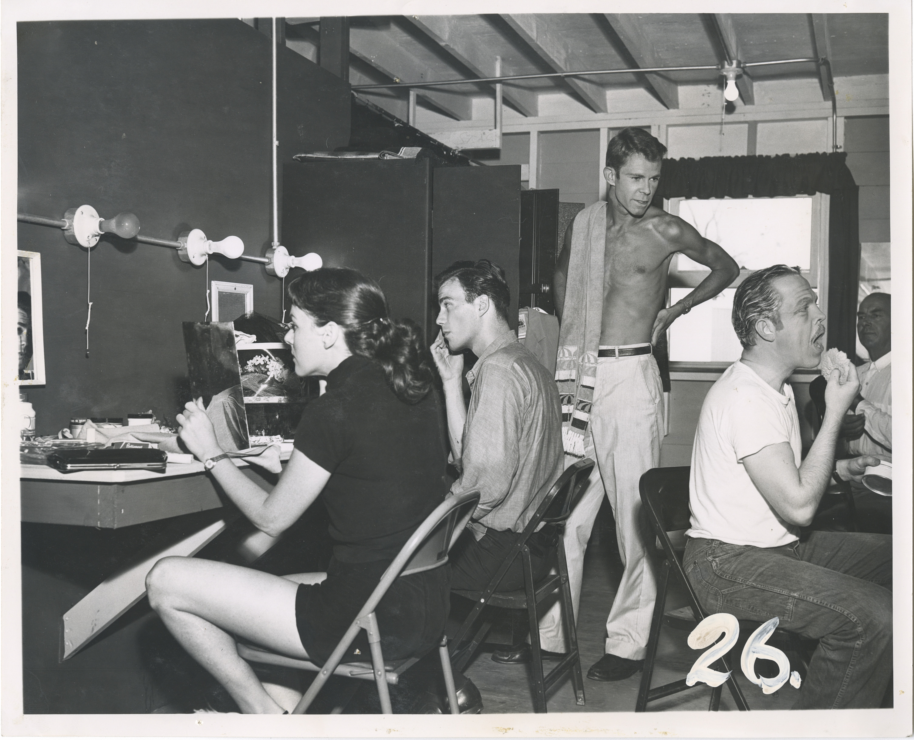 This undated, black-and-white photo shows five actors in a dressing room at Playhouse on the Green (POG). Three are seated and looking into mirrors while putting on makeup, while two others look on. The photo was likely taken circa 1955-57.