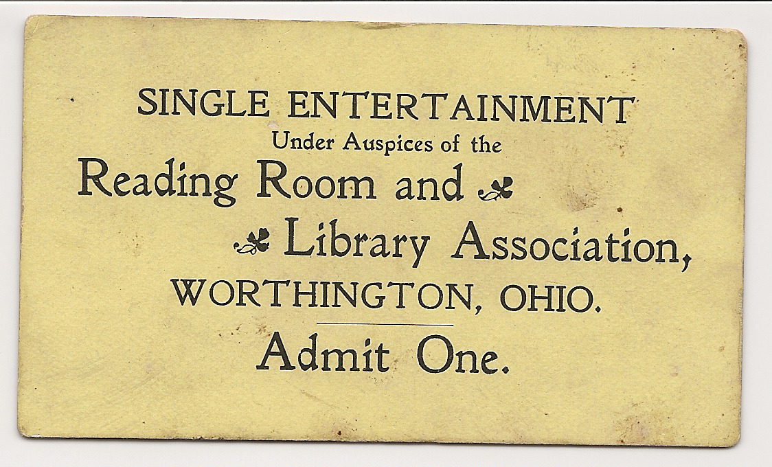 In the early 20th century, a women's Shakespeare study club known as the Fortnightly Club supported the Worthington Reading Room and Library by hosting special events to benefit the Library. The first of these was held on February 14, 1902 in the home of Mrs. Bessie Herrman, a club member. An account of the event reports that her home was lit by a number of candles and those working were dressed in costumes "as if they had walked out of an old picture." This event raised $25 for the Library with the club voting to make a small remembrance of the maid who answered the door. While the exact date and function of the particular ticket depicted here is not known, the ticket probably dates to the time period of 1902-1908. The meeting minutes of the Fortnightly Club in the Worthington Public Library archives indicate that fund raising events for the Reading Room and Library were held regularly during this time. The mission of the club was "to stimulate its members." Its motto was: "Who does the best his circumstances allows, does well, and acts nobly; angels could do no more."