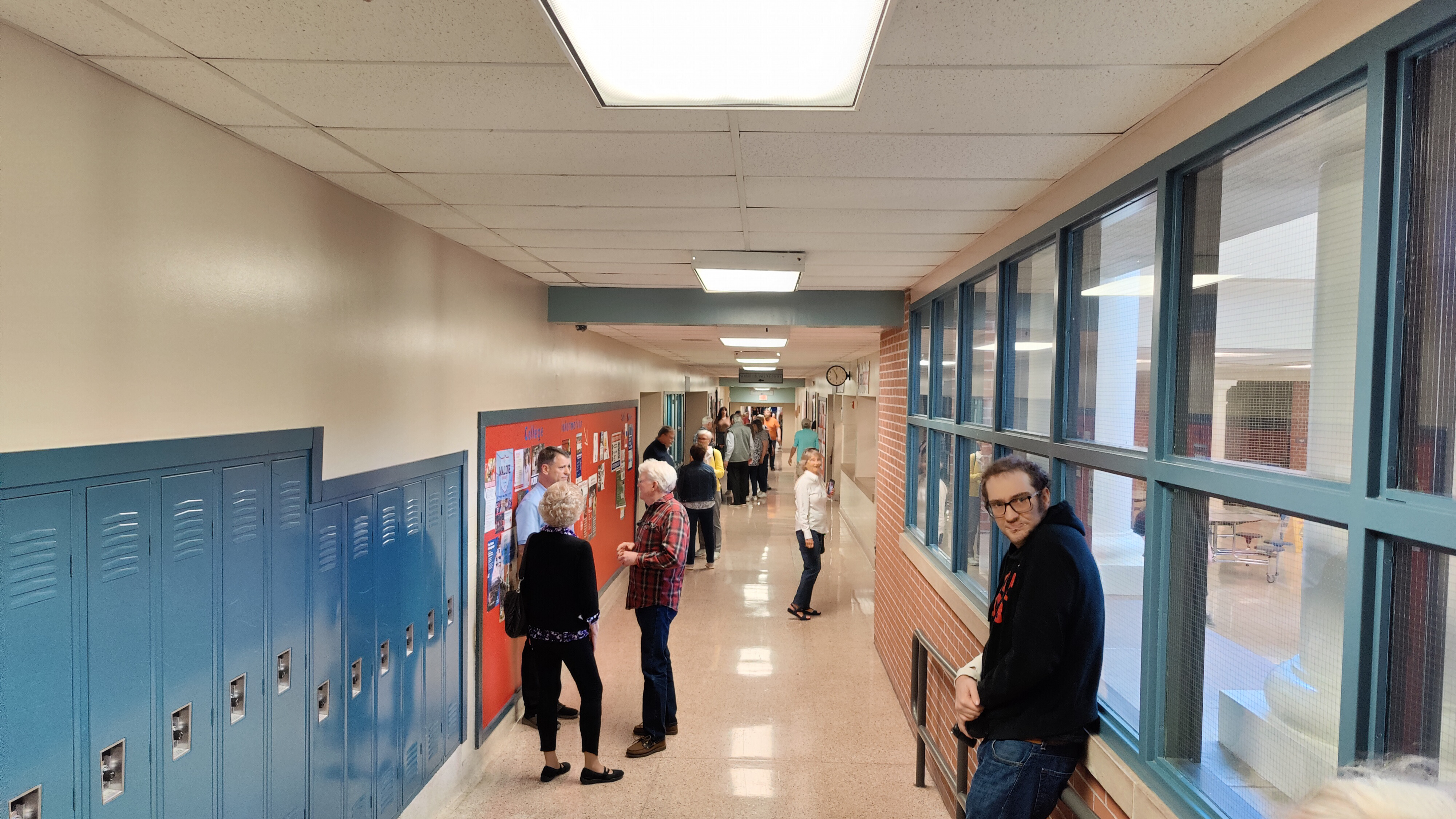Pictured here are Thomas Worthington/Worthington High School alumni taking part in a tour hosted by the high school on April 11, 2023. They are shown standing throughout a hallway, with lockers and a bulletin board along the left side the of the hallway, and windows to the right. Alumni were invited to walk through the school one last time before work began to renovate it. The group was taken through the building’s hallways, classrooms, library, theater and grounds, as well as shown a presentation outlining the plans for the extensive renovations which were anticipated to begin in June, 2023, with a completion date in 2026.