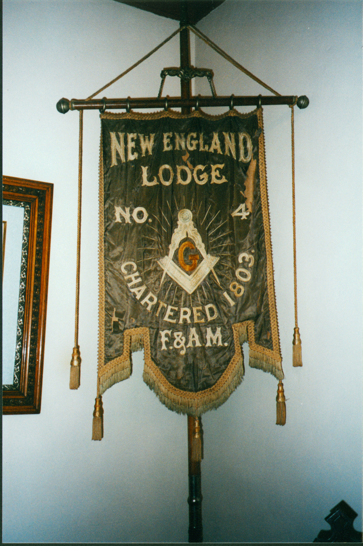 This is a banner belonging to New England Lodge No. 4, chartered on October 19, 1803. Masonic Lodge banners are a local tradition, identifying the Lodge. This banner has been used in parades and for ceremonial purposes.