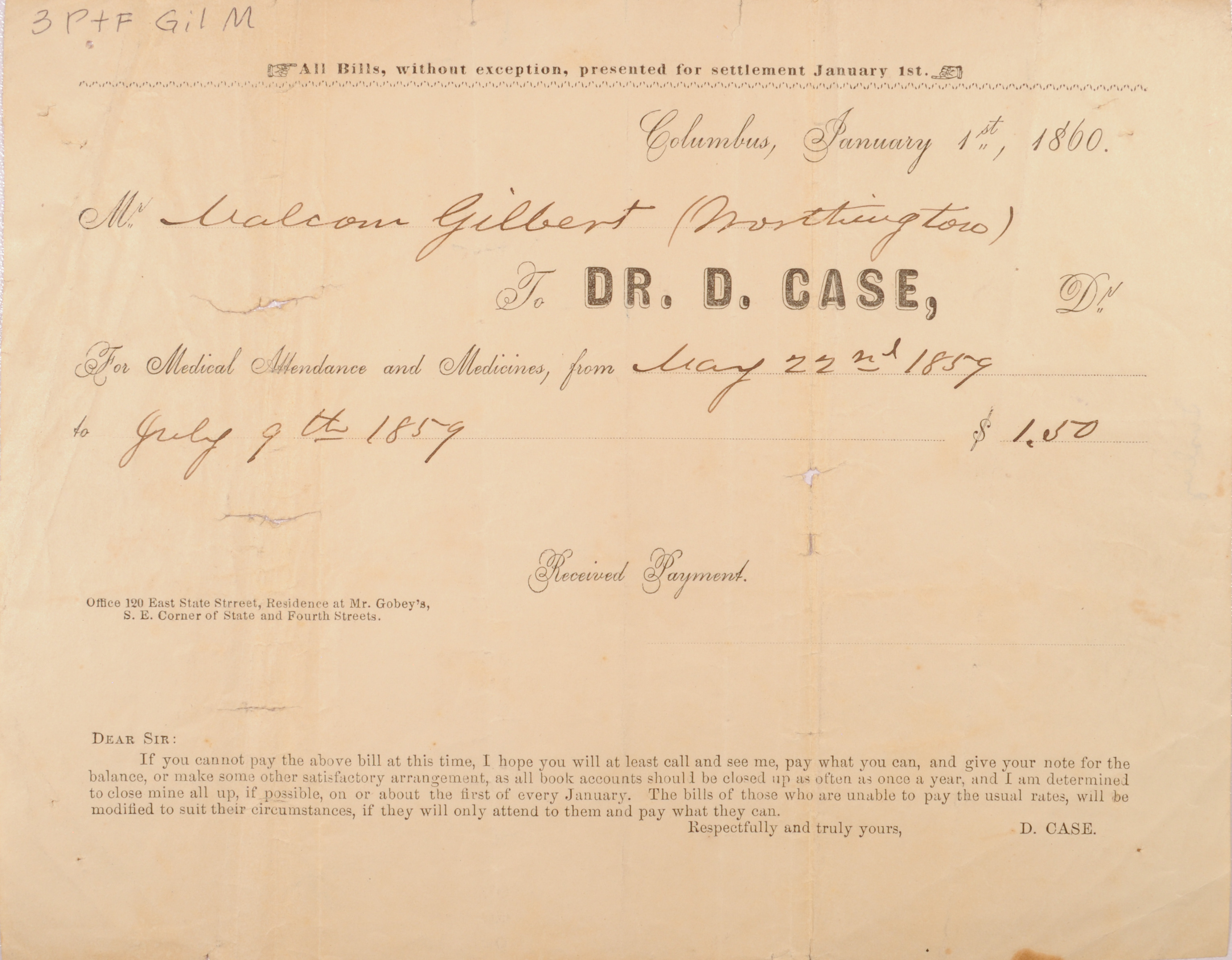 This bill, dated January 1st, 1860, was provided by Dr. D. Case of Columbus, Ohio to Mr. (John) Malcolm Gilbert (b. 1832, d. 1920) of Worthington, Ohio for "medical attendance and medicines" from May 22nd, 1859 through July 9th, 1859. The fee for services was $1.50.