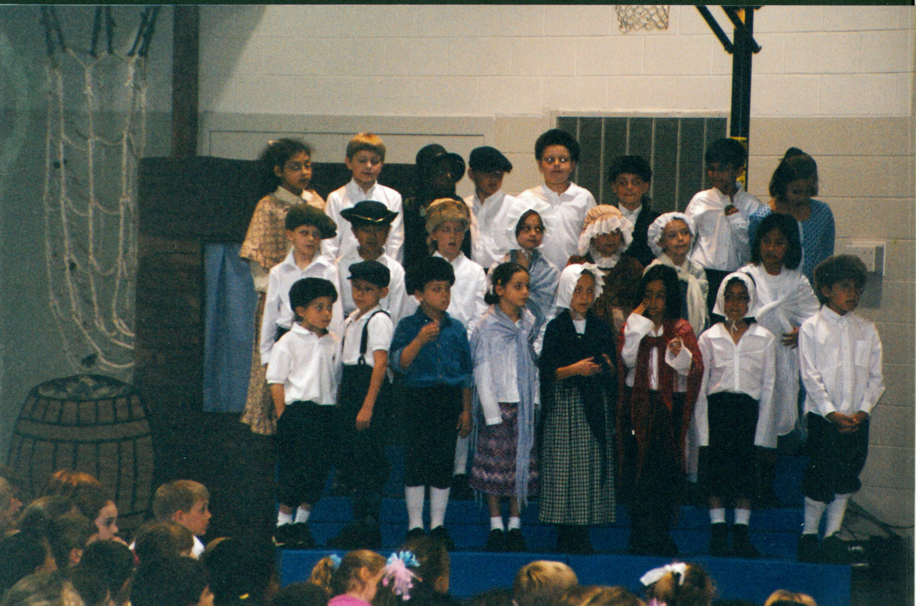 Students at Bluffsview Elementary School learned songs, musical games, and dances from Ohio in the early 1800s as part of the school's Worthington Bicentennial Arts Project. The project culminated in a Bicentennial Arts Open House at the school on May 1, 2003. Second graders performed "Fun with Folk Music", depicted in this photograph.