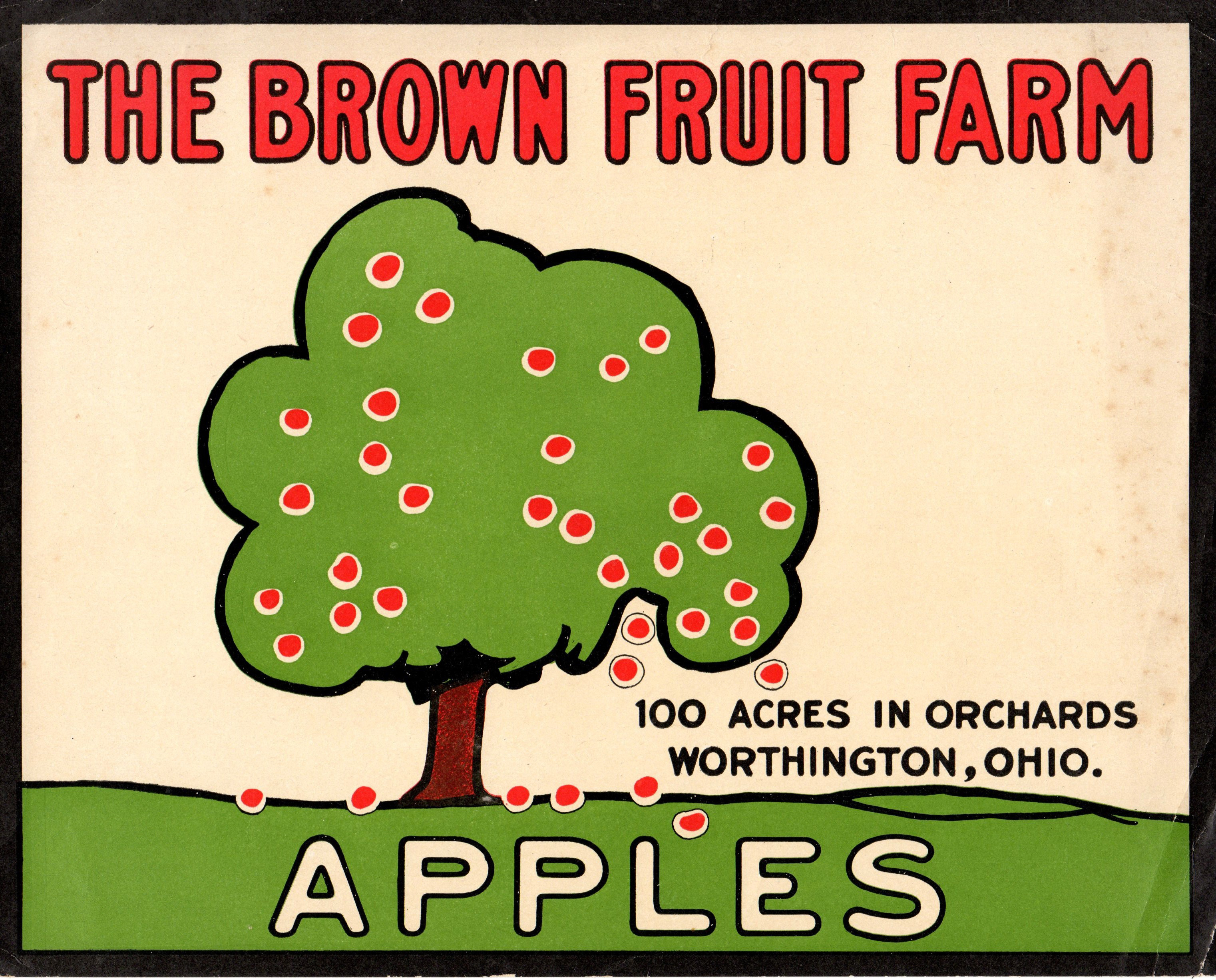 The Brown Fruit Farm operated north of Worthington for nearly fifty years, from around 1912 to 1958. The farm grew and sold apples and apple products such as juice, candy and apple butter, as well as cherries, plums and honey. As of 1925, the farm encompassed 100 acres planted with 4000 fruit trees and was the largest fruit farm in central Ohio. It was renowned not only for the quality of its produce, but also for its innovative roadside marketing, including signs telling motorists how many miles they were from the farm.