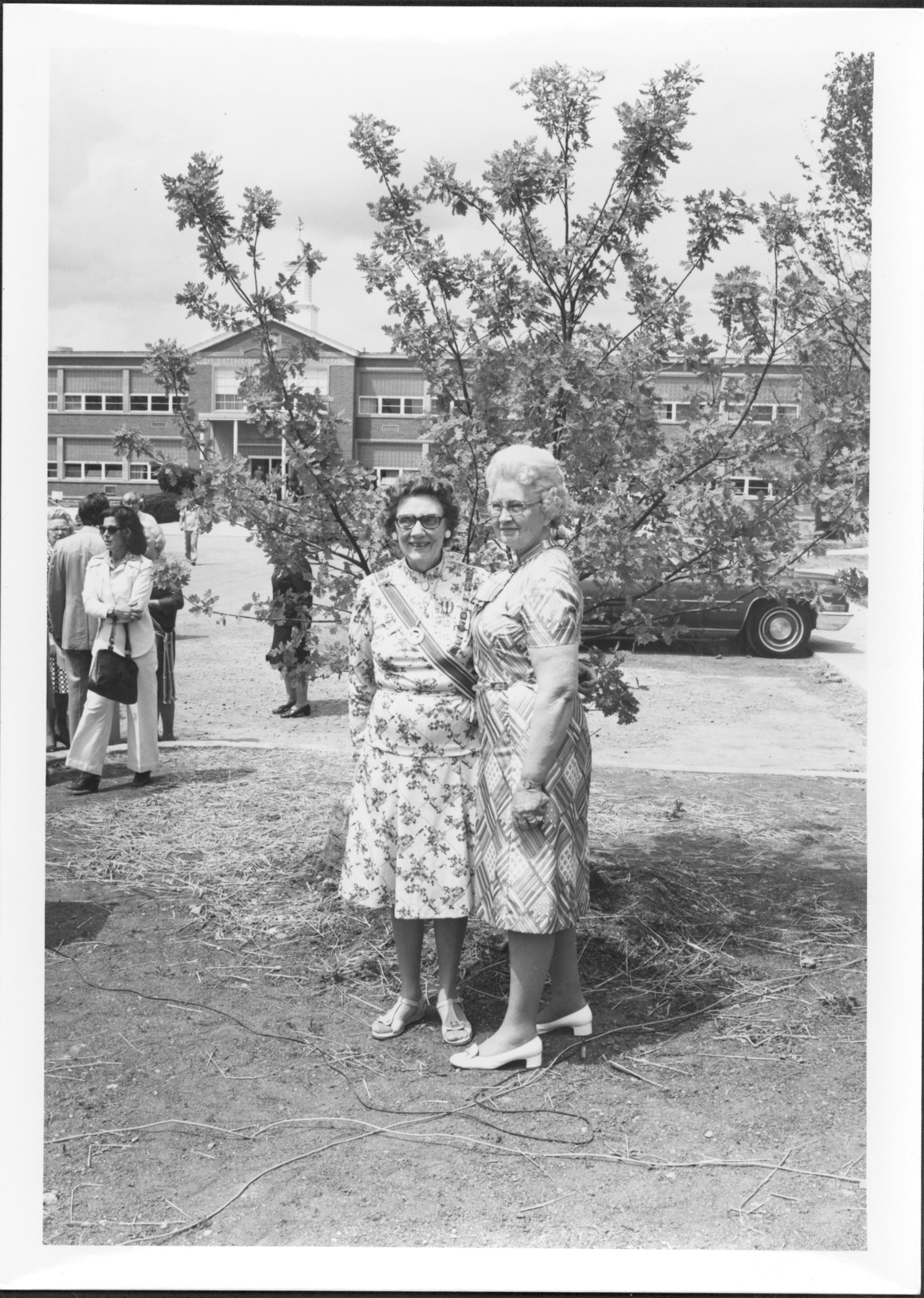 A Bicentennial Charter Oak was dedicated at a ceremony held on the front lawn of Worthington High School, May 26, 1976. The tree was a gift to Worthington Schools from the Worthington Chapter Daughters of the American Revolution in honor of the nation's Bicentennial. Pictured here are Mary Virginia Harding (right) and a State Officer of the Ohio Society Daughters of the American Revolution (left). The white oak represents Connecticut's "Charter Oak", whose story holds special significance in Worthington. Mary Ellen Minton, the DAR's Bicentennial chair suggested the oak as Worthington's founders were from Connecticut.