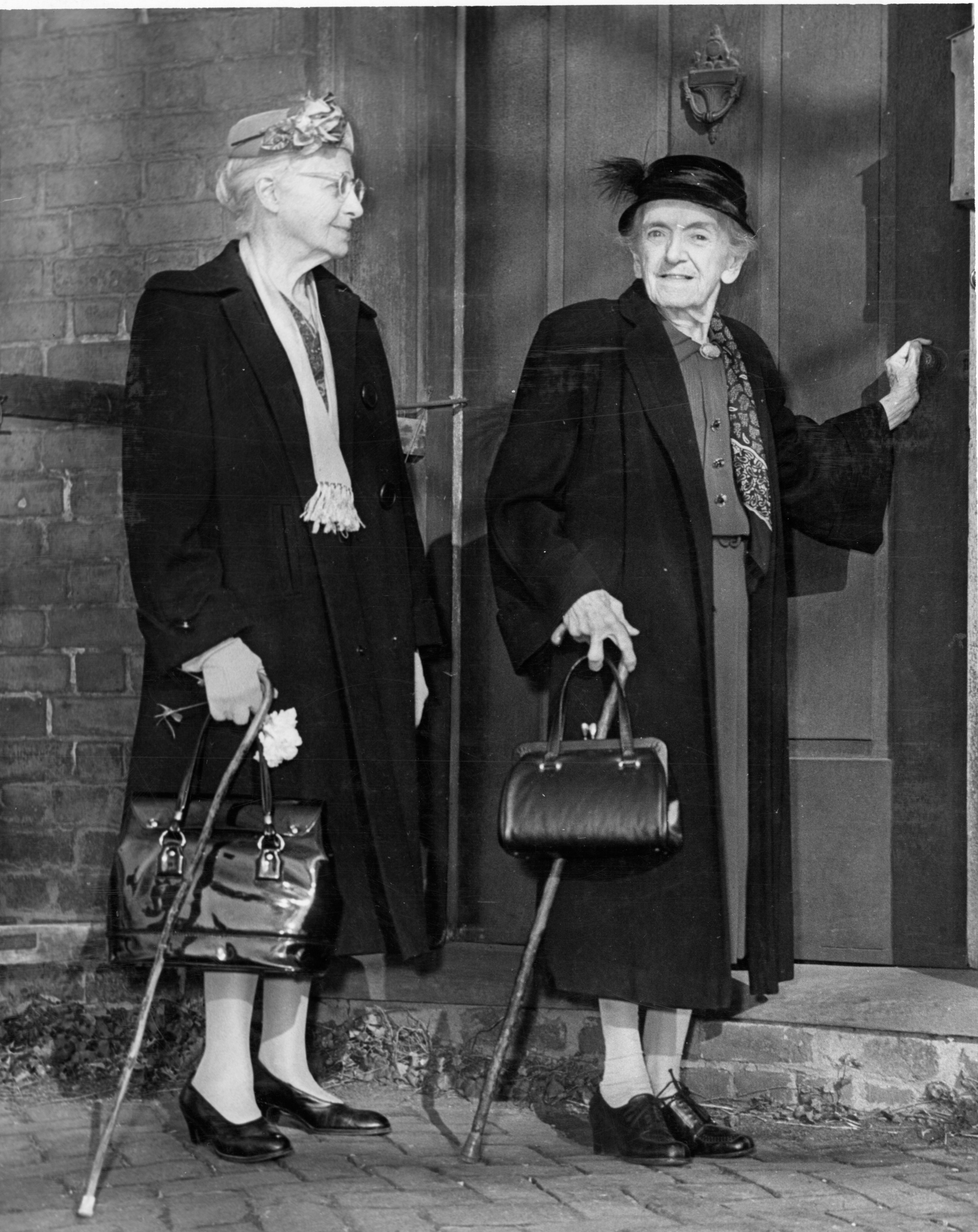 Sisters Edith Ligda (b. 1883, d. 1974) and Ruth Griswold (b. 1876, d. 1965) are pictured here leaving the Griswold Inn for the last time in early 1964. The Griswold Inn was originally constructed in 1811 by their grandfather Ezra Griswold, who was one of the founders of the Village of Worthington. Its location near the center of the Village of Worthington, which is intersected by State Rt. 23 (High St.) and State Rt. 161 (Granville Rd.), contributed to the Inn becoming a popular stopping place for travelers. It was also frequently the site of community gatherings such as social dances, meetings, and town business. The Griswold Inn was eventually converted into a residence. The structure was demolished in 1964 despite efforts from members of the community to save the historic building. Ruth Griswold was the last occupant, leaving Worthington in January 1964 to live with her sister Edith in California before the building was razed.