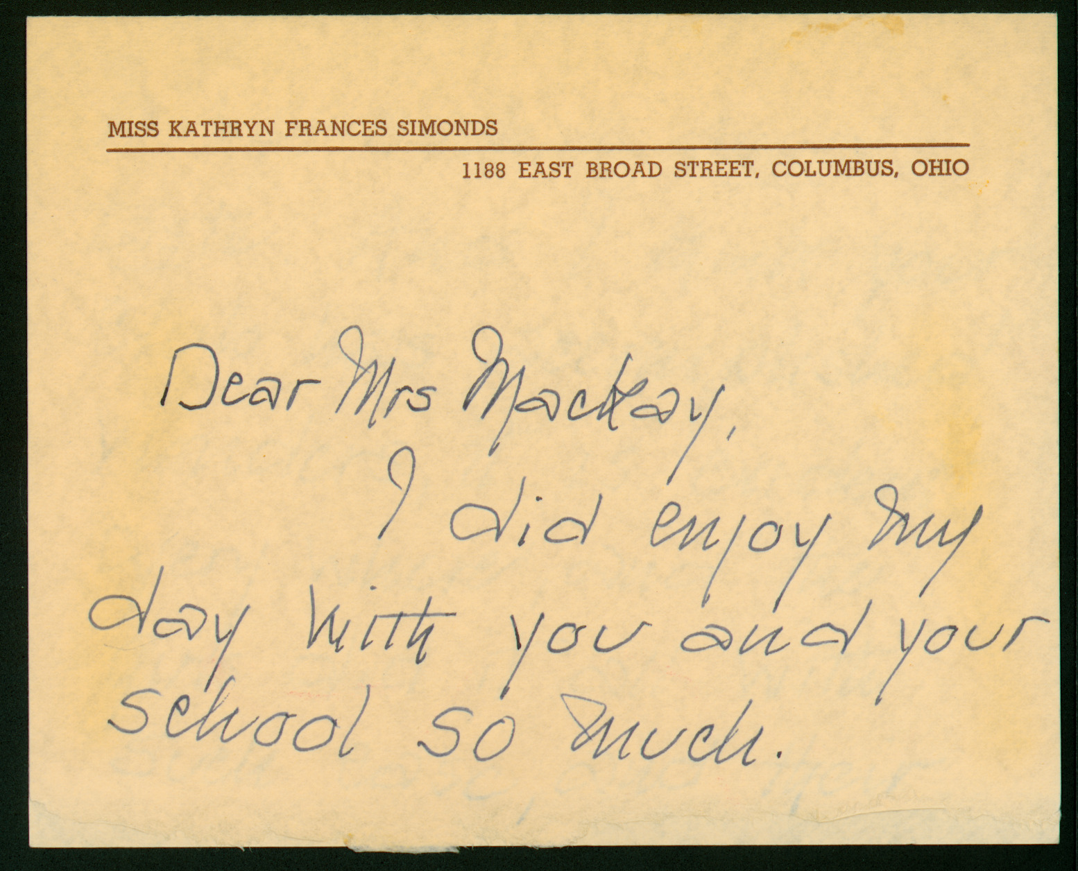 Kathryn Simonds of the Columbus School for Girls writes in regards to a visit to an event arranged by the Personality Club of Worthington, in which she spoke on "The Importance of Manners in Every Day Life." Miss Simonds also taught dance classes for the Personality Club of Worthington, which later became the Worthington Activity Club. The Personality Club was formed in 1937 to "bring all new opportunities for social activities, with the accent on personality development – not to entertain, but to stimulate correct thinking about social problems, to strengthen personalities, over come shyness and eliminate class distinctions."