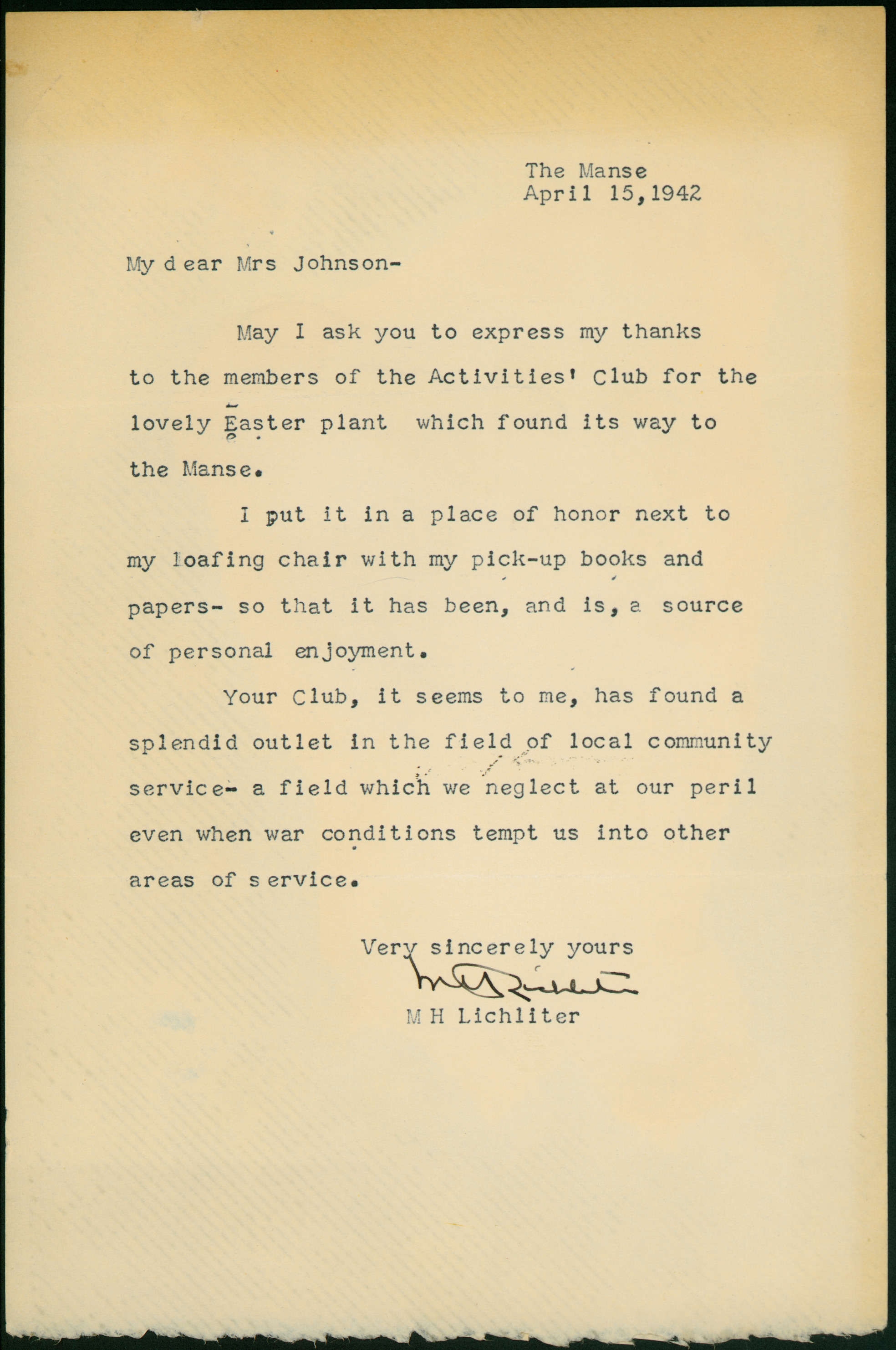 Rev. McIlyar Hamilton Lichliter, pastor of First Congressional Church in Columbus was the featured speaker in the first of a series of religious programs arranged by the Activity Club of Worthington in 1942. This letter of thanks to the club following the program refers to the impact of World War II on society.