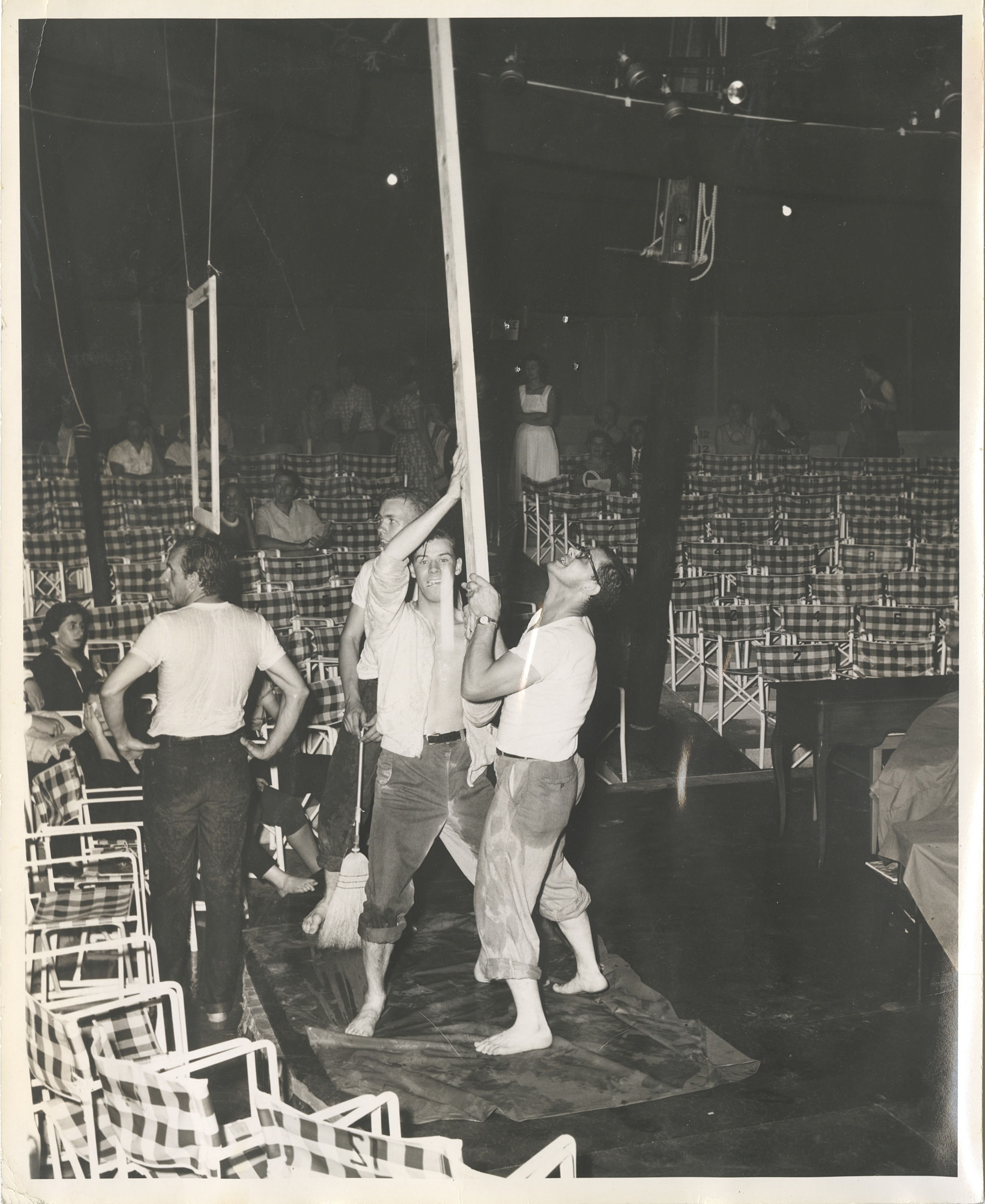 This black-and-white photo, circa 1955-57, shows the stage and seating area at Playhouse on the Green (POG). On stage, what appears to be several crew members are shown lifting a ladder towards the ceiling, while other people--either audience members, or cast and crew--sit in and stand near the checkered seats in the background.