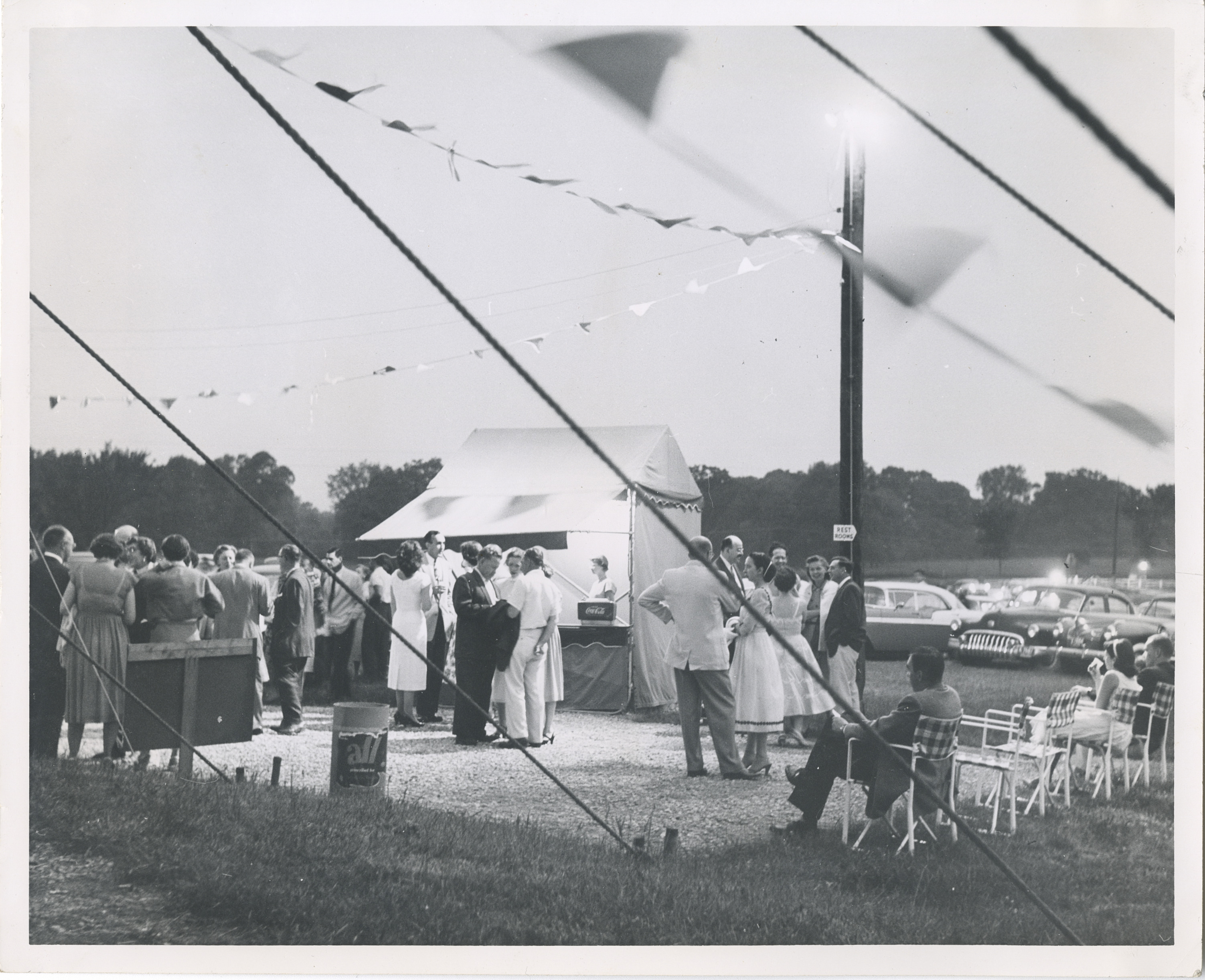 This undated, black-and-white photograph shows a crowd of people waiting in line at the concessions tent at Playhouse on the Green (POG). The photo was likely taken circa 1955-57. In the foreground are lines supporting the theater tent, anchored to the grass surrounding the graveled concession area, and lines with pennant flags wave in the breeze. In the middle ground, a line of people waits at the concession stand, while other groups stand chatting or sitting in checkered chairs nearby. In the background is a parking lot with cars, and fields and trees in the distance beyond that. A trashcan with an advertisement for All detergent is visible near the concessions area; All detergent was born in Columbus, Ohio.
