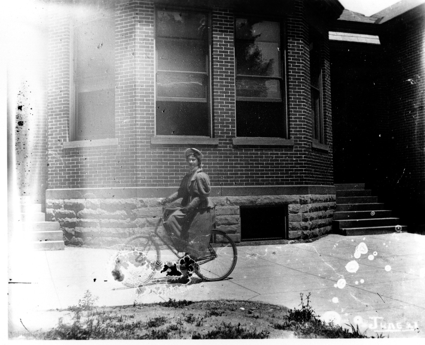 An unidentified young woman is pictured in front of the old Worthington High School, located on East Granville Road. The bicycle became a popular mode of personal transportation during the 1890's. Women especially enjoyed the freedom that this new recreational activity provided.