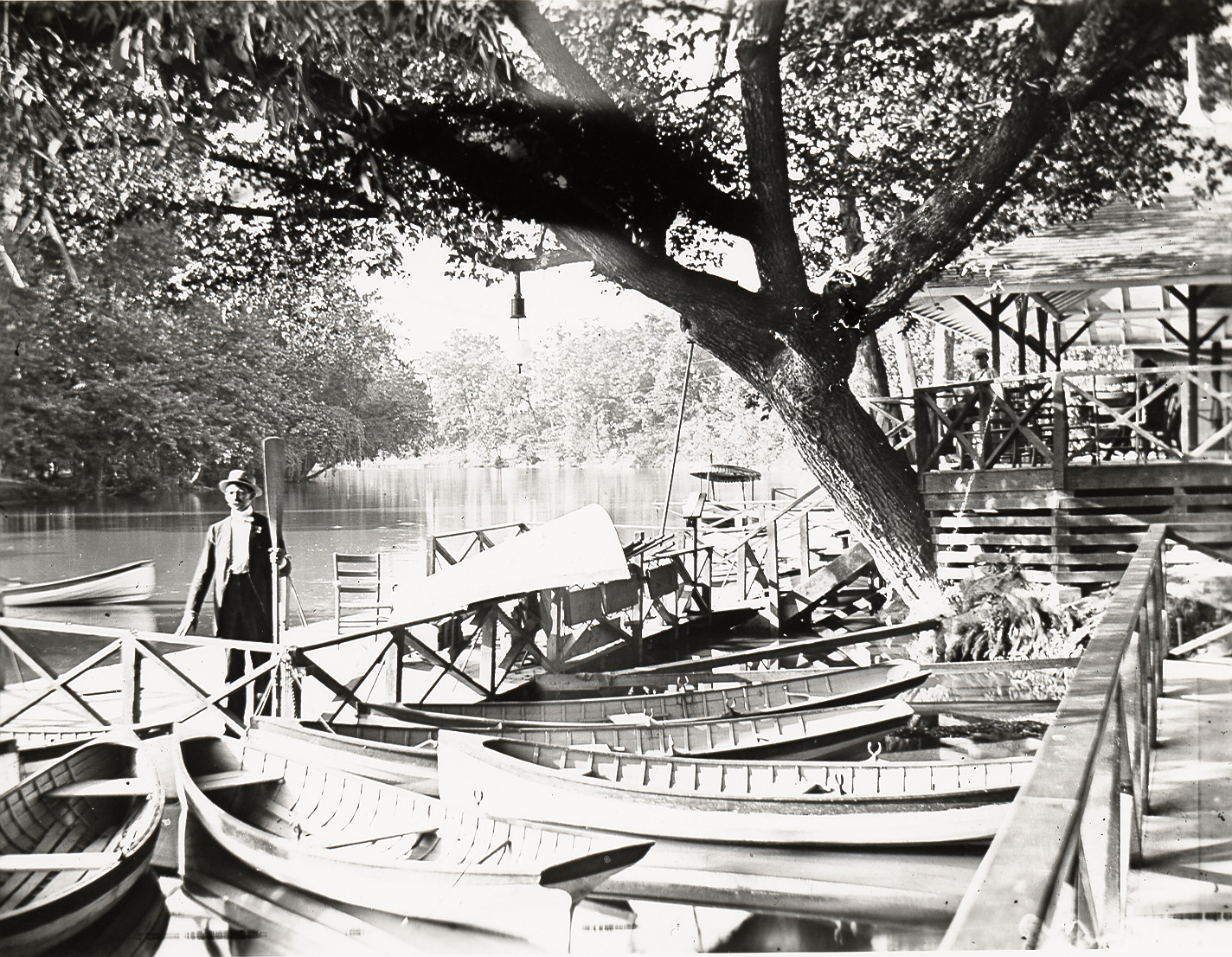 Edwin V. Griswold (b. 1879, d. 1950) is shown here tending canoes at the boat house at Olentangy Park. The Park was located in north Columbus, a few miles south of Worthington along the Olentangy River. Edwin Griswold was a son of Fondelia Ruth and Worthington Franklin Griswold and was a great grandson of Ezra and Ruth Roberts Griswold, pioneer settlers of Worthington.