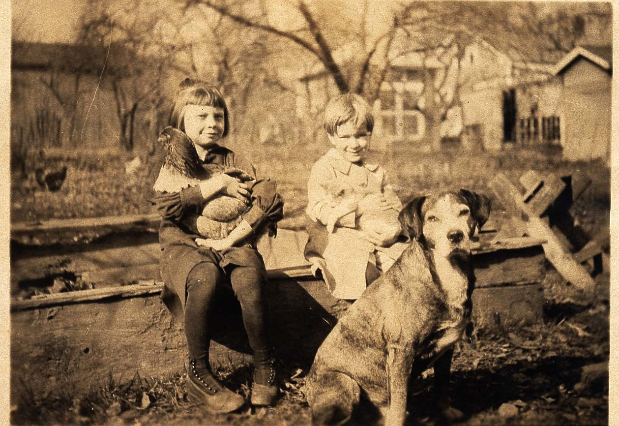 This photograph shows two children sitting outside holding animals. Ellen Gloyd (left) holds a chicken. She was born to Katherine Vest and Elmer Gloyd in 1909. She attended The Ohio State University and graduated with a Bachelor of Science in Education in 1932, having been elected as a member of Scholaris, which was a freshman women’s honorary society. She lived at 119 East Dublin-Granville Road.