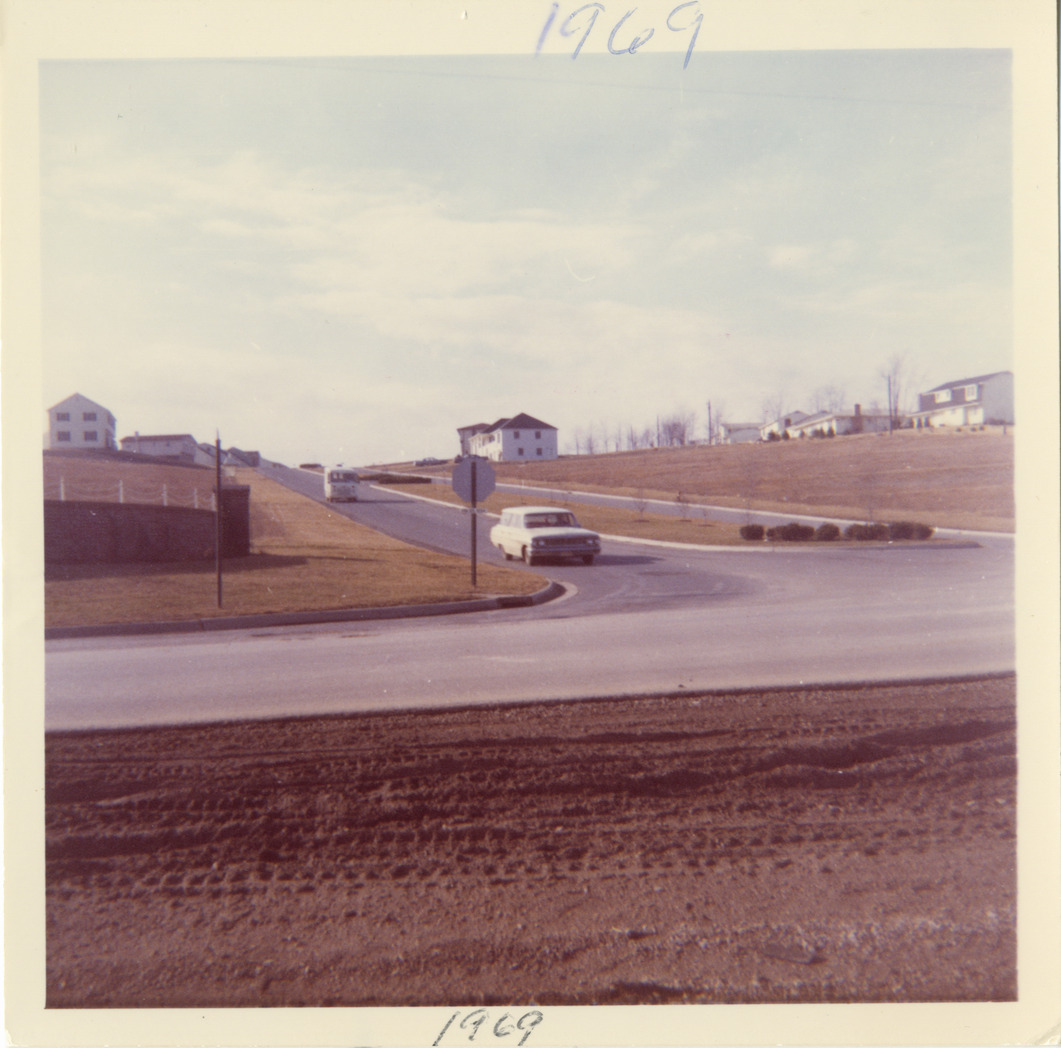 This photograph shows the entrance to the Worthington Hills neighborhood, at the intersection of Clubview Boulevard S and Olentangy River Road/315, as it appeared in 1969. Two cars are visible leaving the neighborhood, one waiting at a stop sign at Olentangy River Road. Visible in the background are several homes, including those that might be 776 and 777 Clubview Boulevard S.