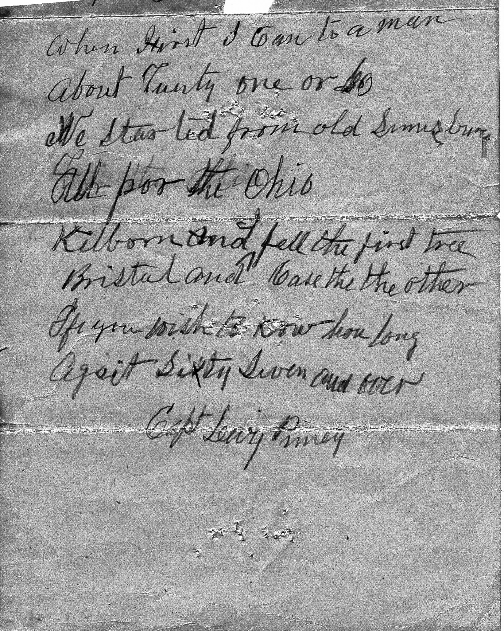 Capt. Levi Pinney (b. 1782, d. 1869) relates the felling of trees on Worthington's Village Green in the spring of 1803 at the age of 21. He was a member of the Scioto Company's advance party that accompanied James Kilbourn to the land in Ohio that was chosen for the planned community of Worthington. The advance party cleared land, planted corn, surveyed town lots and erected temporary shelters for the remainder of the settlers that arrived in the fall of 1803. Levi Pinney was 67 years old when he wrote this account.