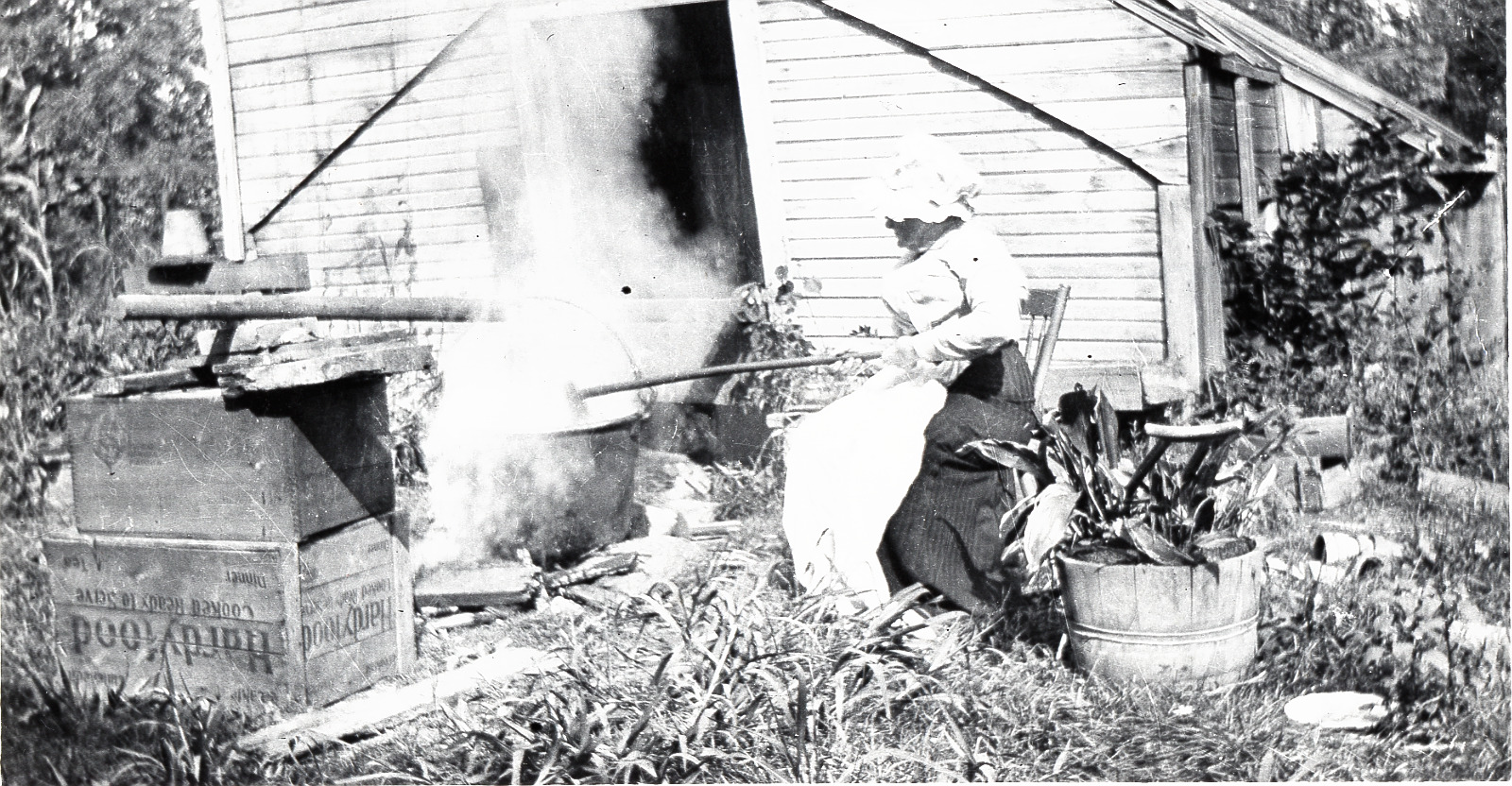 Fondelia Ruth Griswold (b. 1843, d. 1930) is shown here making apple butter in her backyard. Her residence was the former Griwsold Inn, located just north of the northeast quadrant of the Village Green on High Street. The building was torn down in 1964. Fondelia married Worthington Franklin Griswold, who was a justice of the peace and served as mayor of the Village of Worthington.
