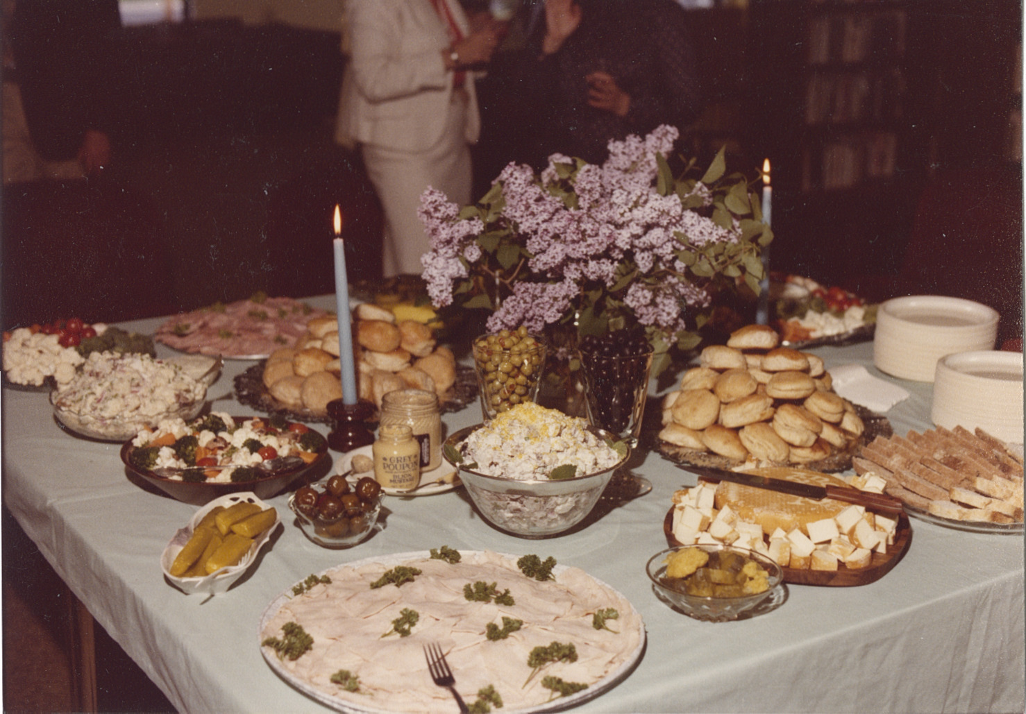 Pictured in this color photograph is a table of food at the wedding of librarian Rachel Alexander at the Old Worthington Library, May 8, 1985. The food, which was provided by staff, includes cold cuts, pickles, bread and rolls, olives, dips and vegetable trays. The table is covered by a tablecloth and has lit candles and a centerpiece of lavender flowers.