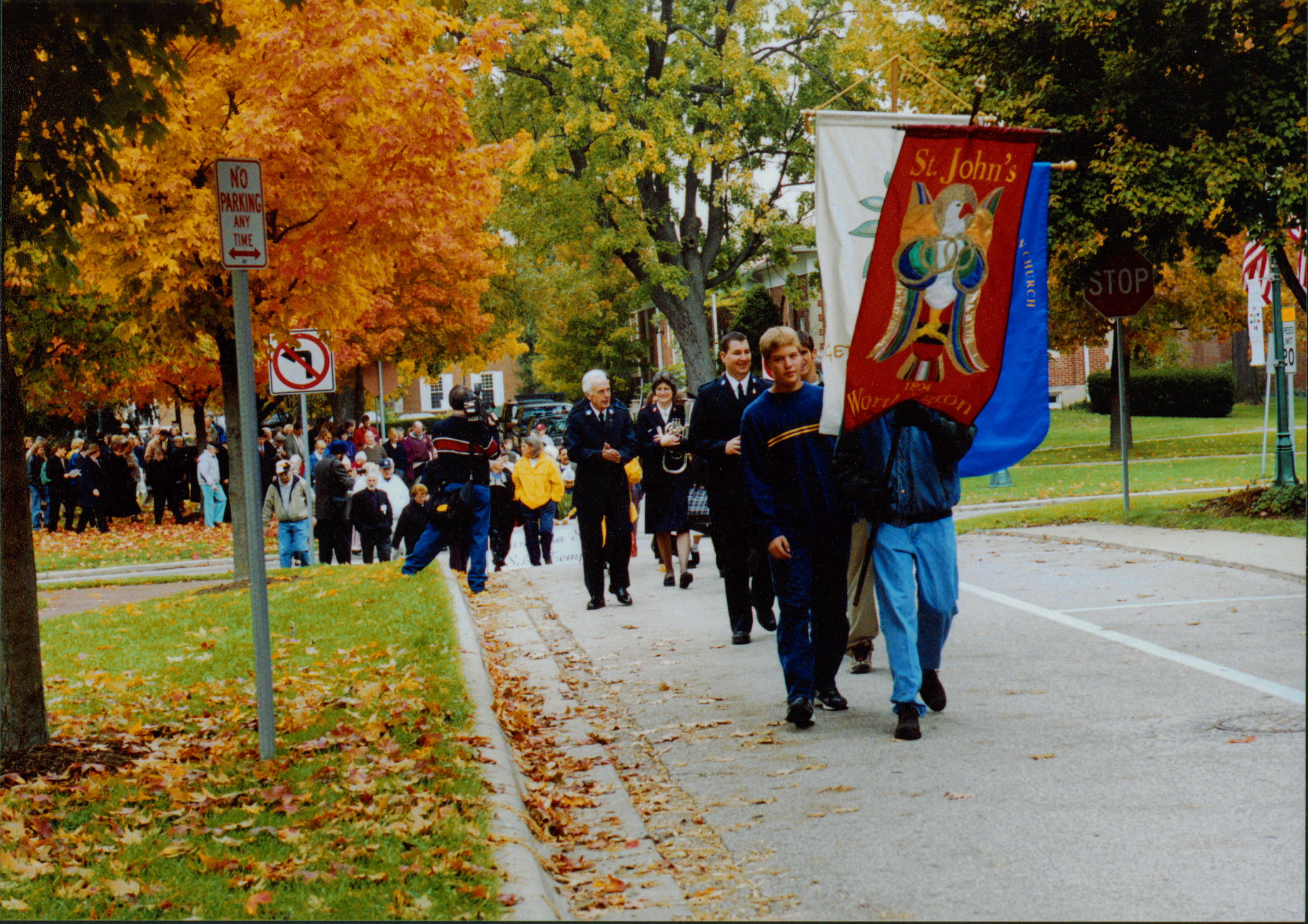 Participants in the Founders Day Service of Thanksgiving gathered on the northeast quadrant of the Village Green the afternoon of October 27, 2002, forming a procession across Dublin-Granville Road heading south on High Street to the Worthington United Methodist Church were an interfaith service was held.