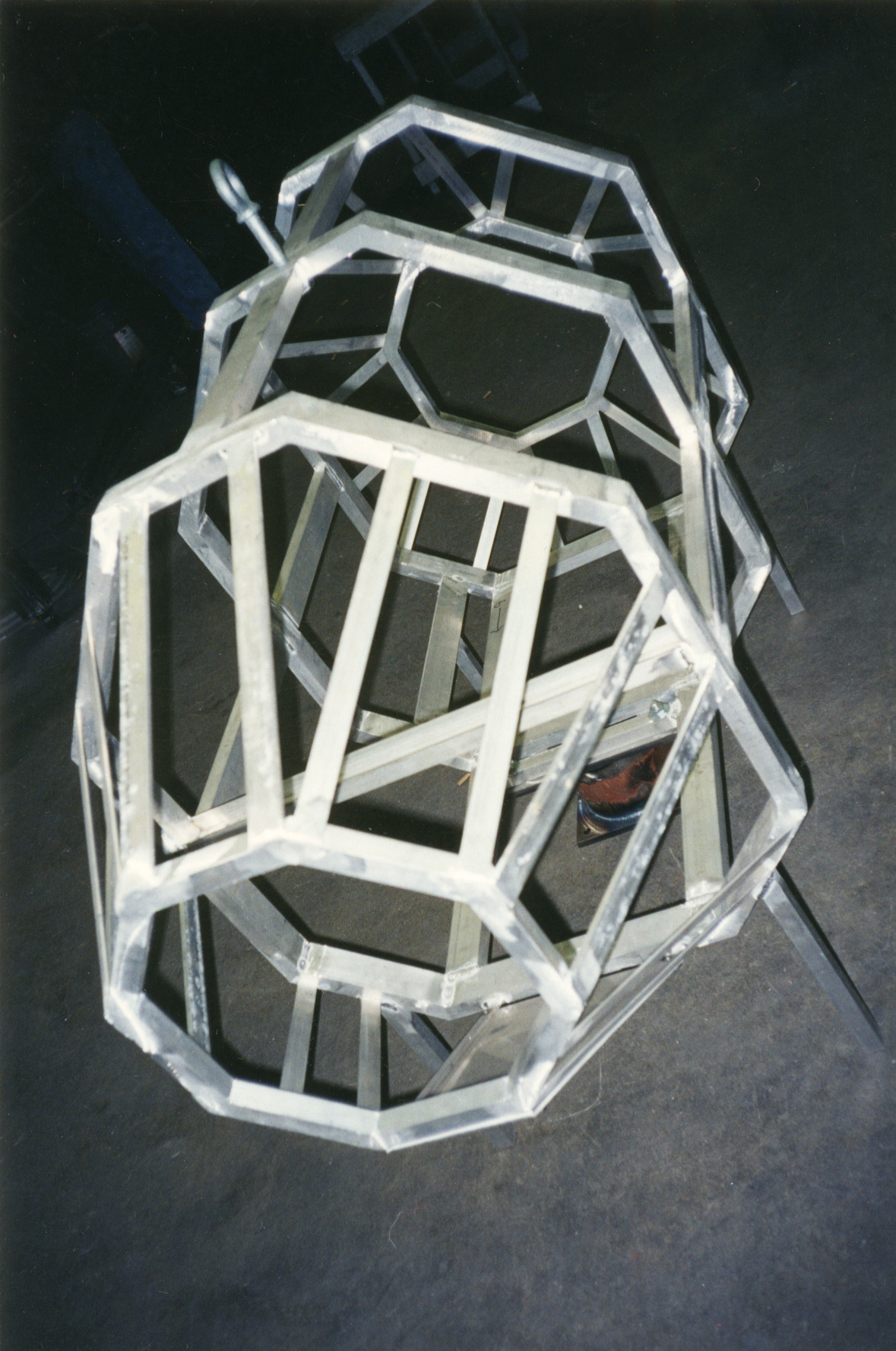 This is one of a series of photographs documenting the construction of the pig statue that would later be displayed in front of the Pig Iron BBQ, 5295 North High Street. The photographs were taken in the garage studio at 180 West South Street of the statue's creator, William (bc) (Bill) Collins. Shown here is the metal frame for the statue, which was built by Fortin. The frame would be covered in high-density urethane and carved and painted by bc, with LED lights added for the eyes.