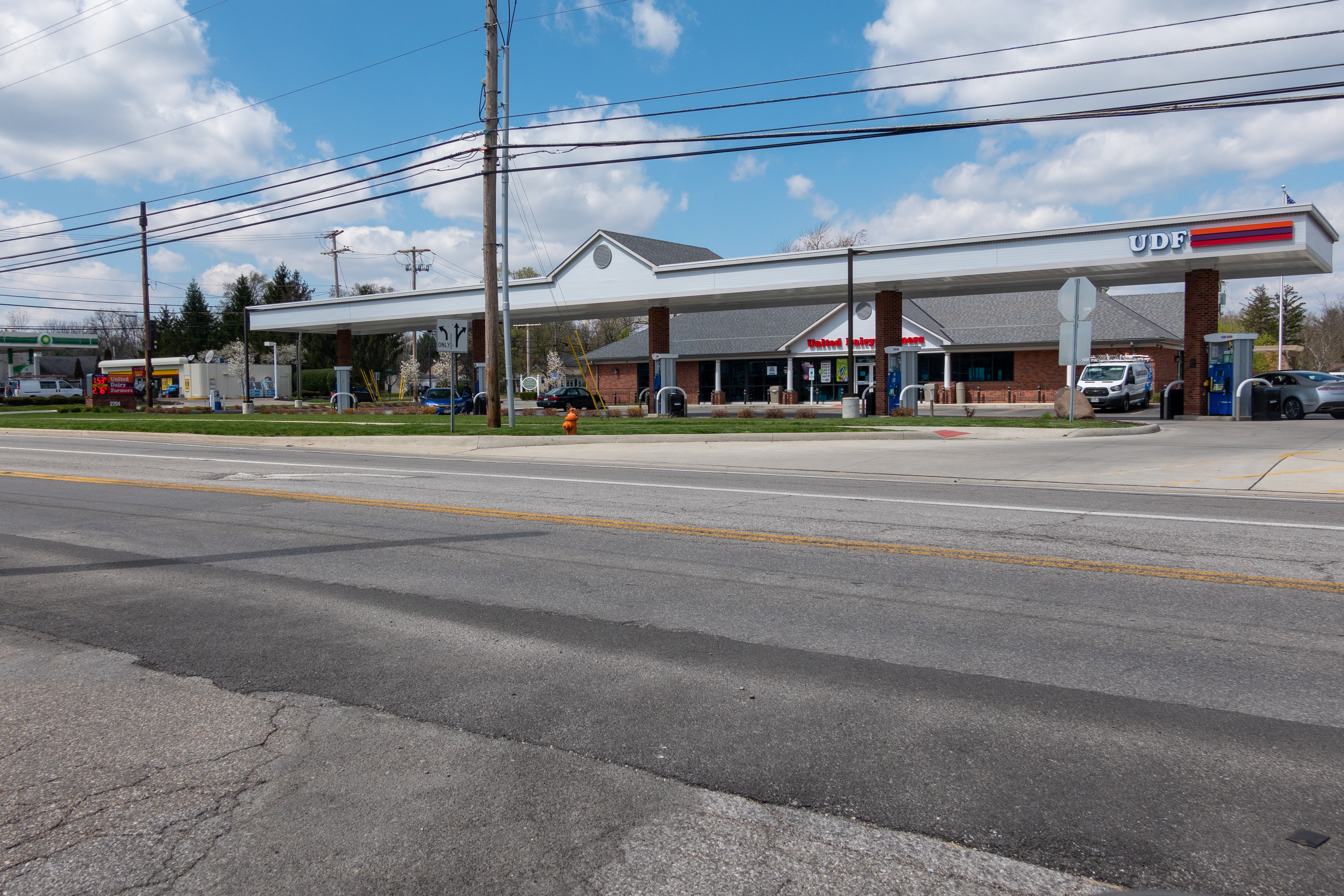 This photograph shows the United Dairy Farmers gas station and convenience store at the intersection of Highway 161 and Linworth Road on April 16, 2020. The parking lot and fueling stations are almost entirely empty, and the price of gasoline, visible in the photo, is much lower than average prices prior to the COVID-19 pandemic. The demand for gasoline and the price of crude oil both plummeted in the early days of the pandemic, due to stay-at-home orders and the larger economic downtown triggered by pandemic fears.