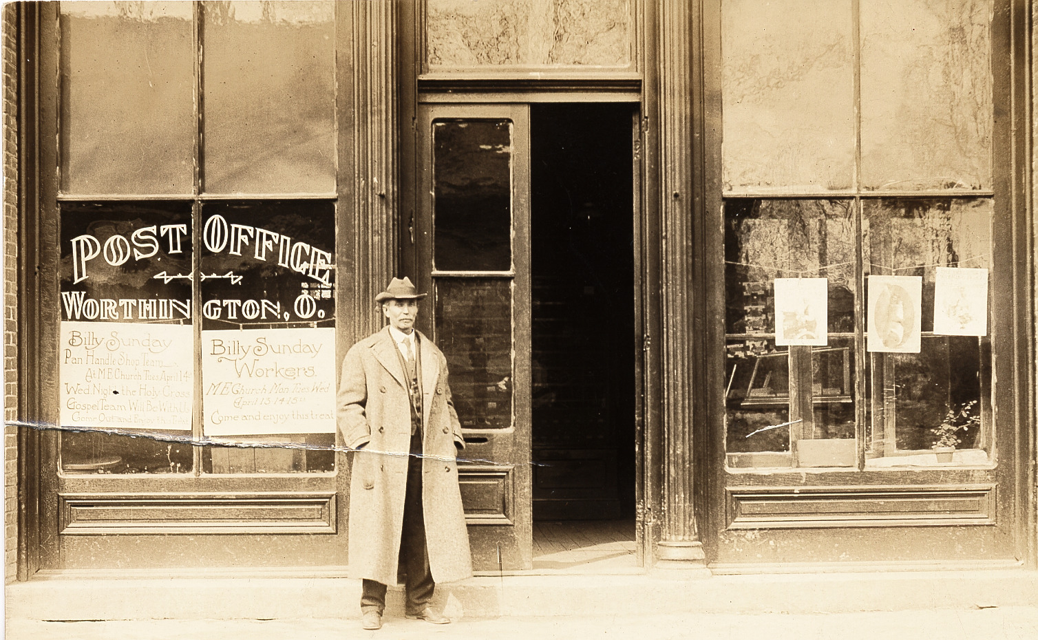 Note the sign in the window of the post office advertises an upcoming visit to the local Methodist Episcopal church by Billy Sunday, National Baseball League outfielder turned evangelist.