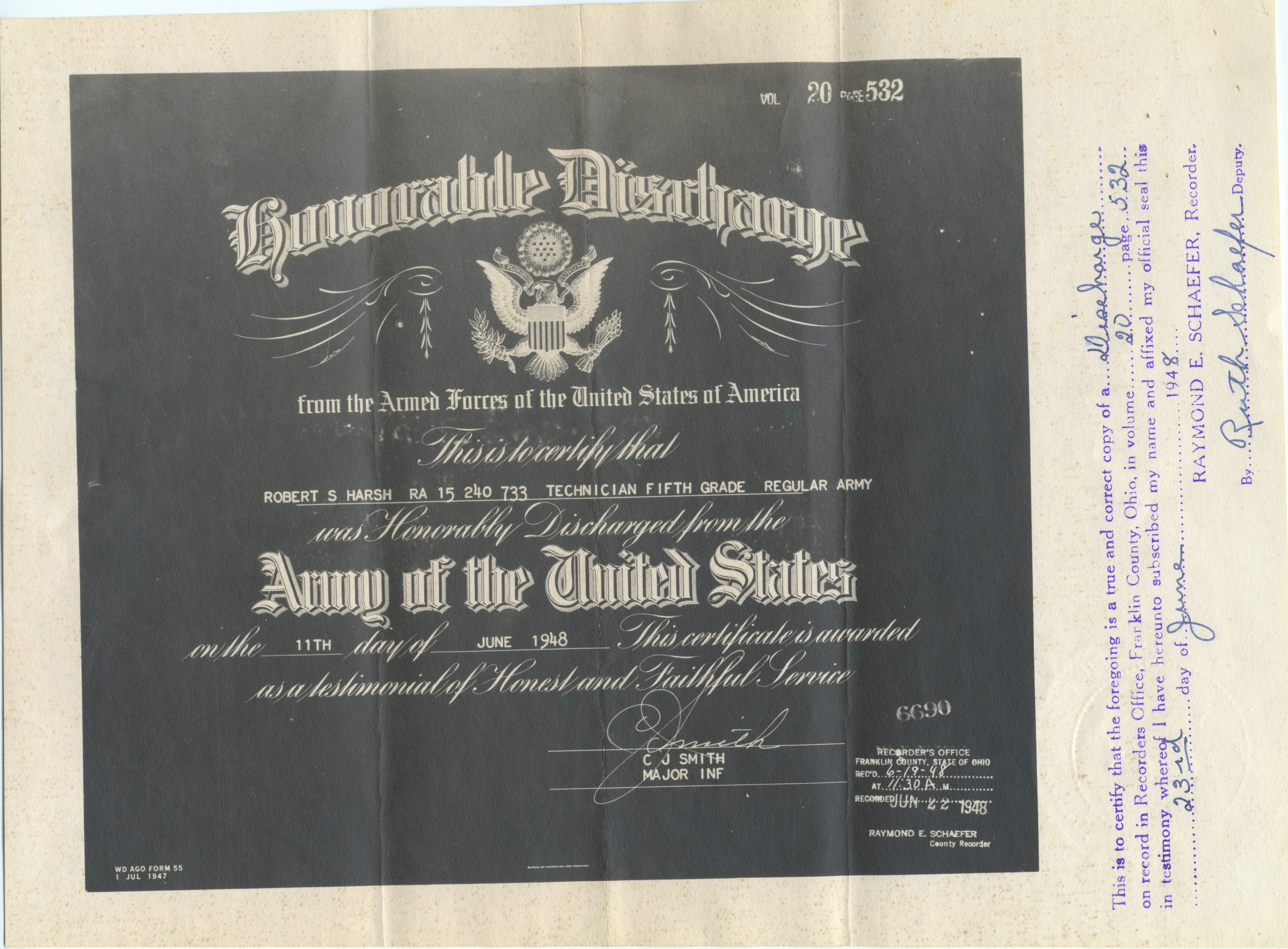 This is a certificate of honorable discharge from the United States Army for Robert Samuel Harsh (1928-2007). Harsh was a veteran of World War II, serving as a Corporal in the Army of Occupation in Korea from 1946-1948. He was a 1946 graduate of Worthington High School and worked for the U.S. Steel Corporation in Pittsburgh and New York City before retiring to Dublin in 1986.