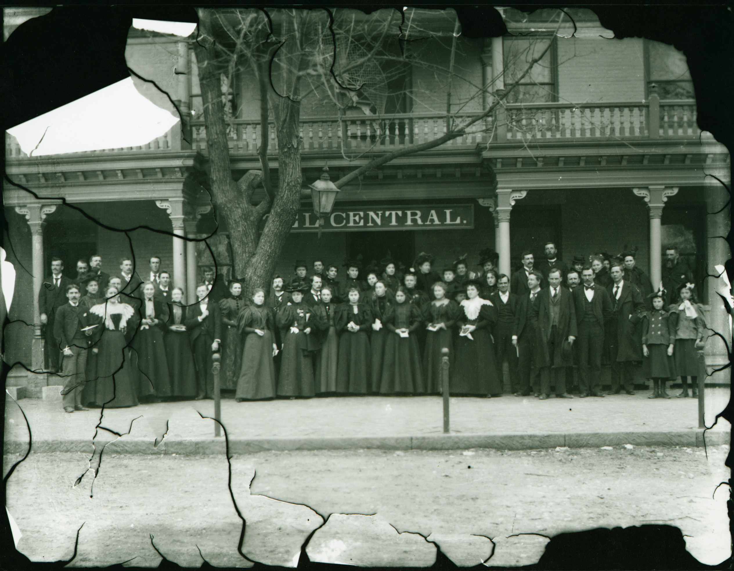 The building depicted here with an unidentified group of people is presently the Worthington Inn, located at 649 High Street, Worthington, Ohio. At the time of this photograph it was known as the Hotel Central. The oldest portion of the Worthington Inn was built as a home for the family of Rensselaer W. Cowles, a Worthington merchant, civic leader and James Kilbourne's son-in-law in 1835. The Inn has had significant additions which reflect the changing architectural tastes of the late nineteenth and early twentieth century. Its Victorian decor reflects its status as Worthington's only remaining nineteenth-century inn.