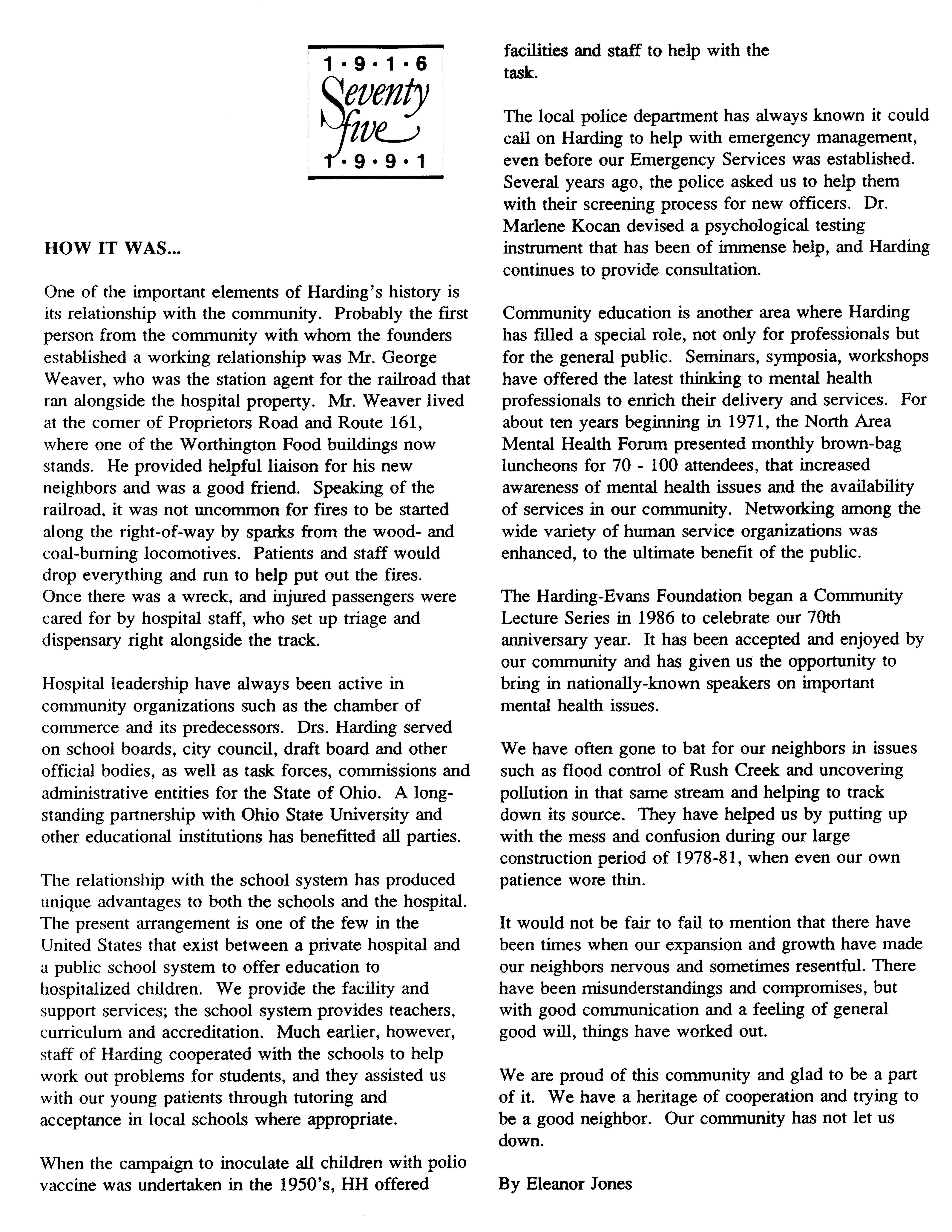 This is one of a series of articles on the history of Harding Hospital. Included in the newsletter distributed to hospital employees, the articles were written by Ellie Jones. This article describes the longstanding relationship between the Harding Hospital staff and the Worthington community.