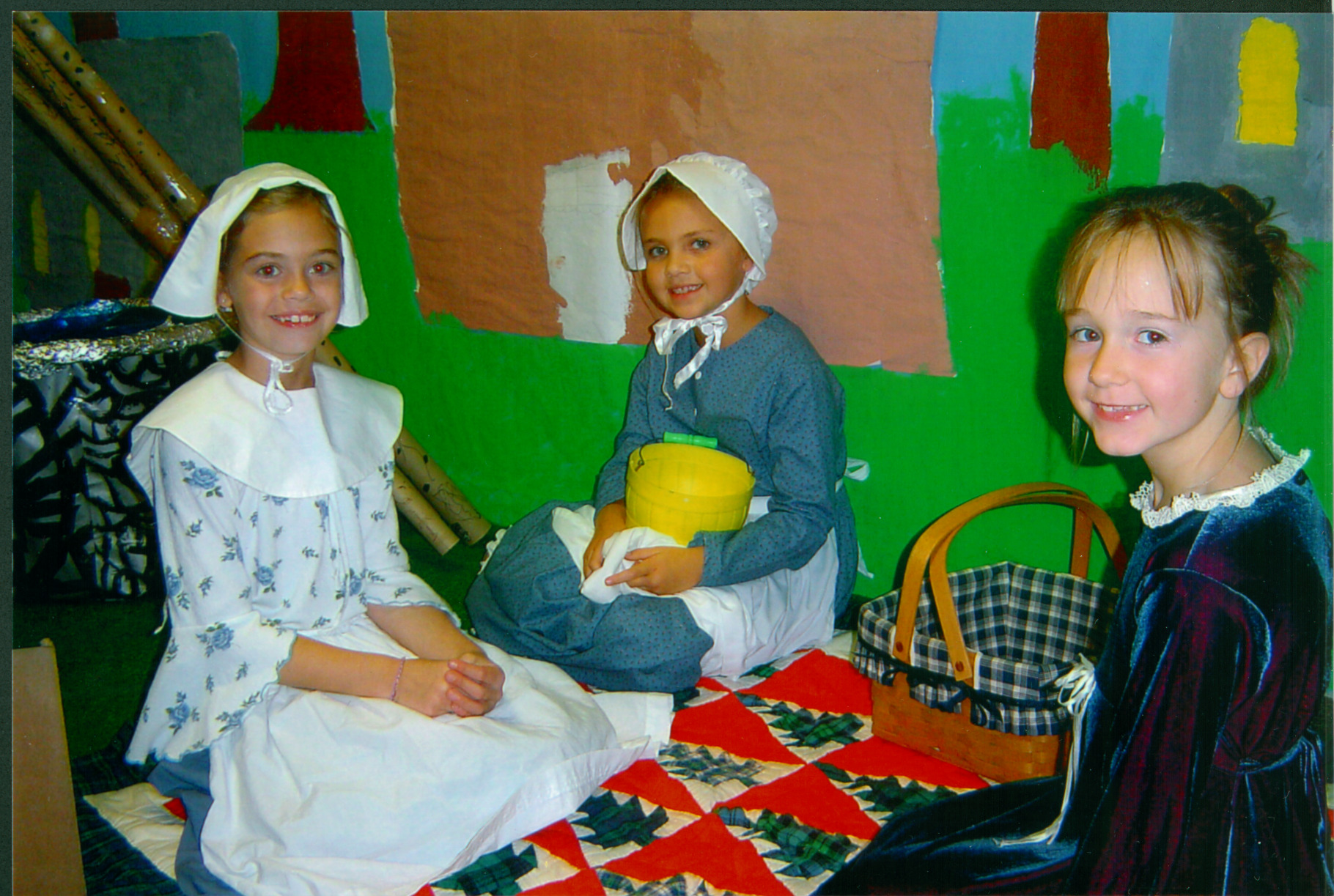 During Worthington's Bicentennial year Granby Elementary students participated in a two-part Bicentennial project, "A Village Called Worthington/If Walls Could Talk". The students learned about the changing landscape of old Worthington from 1803 to 2003 as they studied architecture, people and modes of transportation. The second phase of the project, called "If Walls Could Talk" involved each grade level, first through sixth. Students in each grade researched the history and architecture of selected buildings in Old Worthington and created a large scale 3-D replica of each landmark. Parents were invited to attend an open house where students dressed in period costume and answered questions about the historical development of their buildings. Families strolled the halls learning about Worthington history. Second grade students are shown here portraying early settlers with their topic, the Village Green.