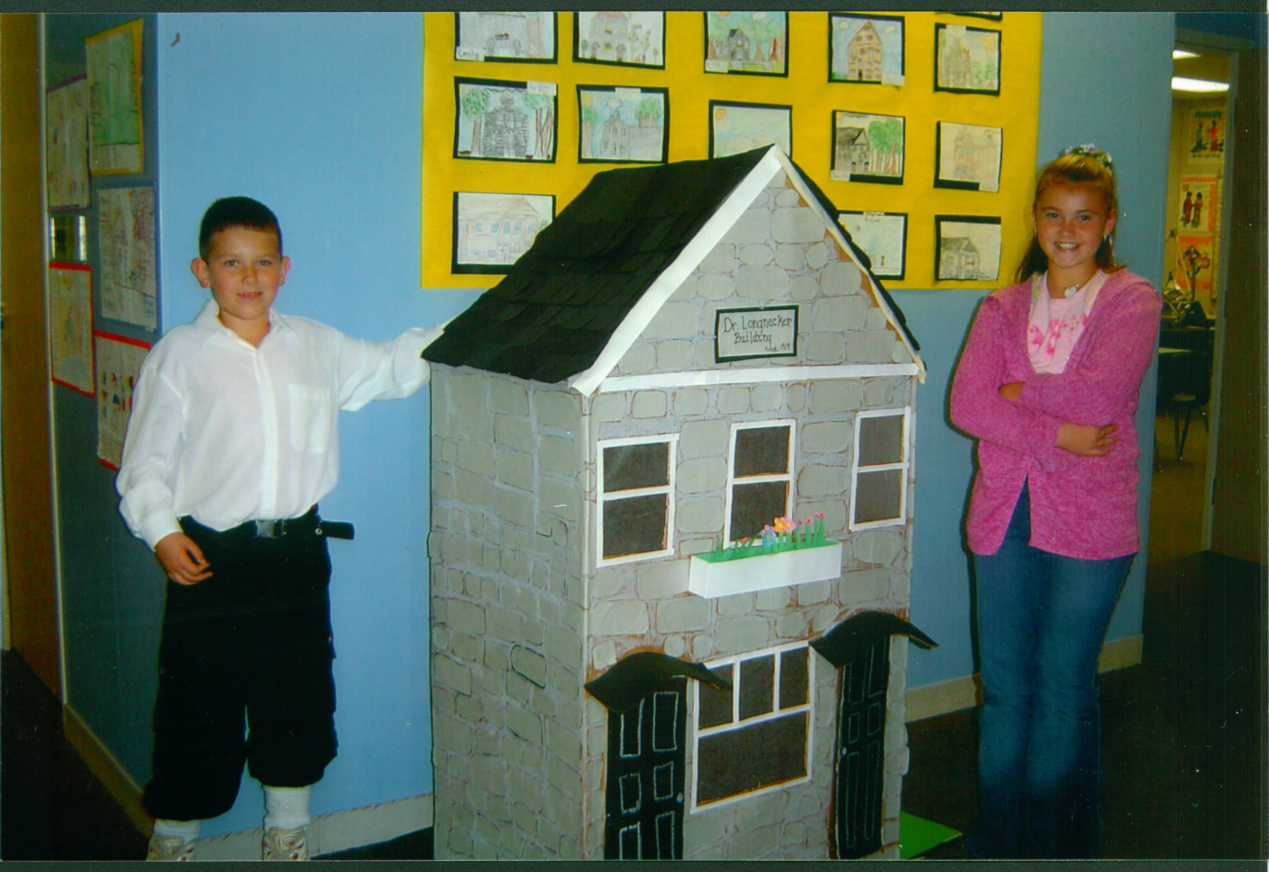 During Worthington's Bicentennial year Granby Elementary students participated in a two-part Bicentennial project, "A Village Called Worthington/If Walls Could Talk". The students learned about the changing landscape of old Worthington from 1803 to 2003 as they studied architecture, people and modes of transportation. The second phase of the project, called "If Walls Could Talk" involved each grade level, first through sixth. Students in each grade researched the history and architecture of selected buildings in Old Worthington and created a large scale 3-D replica of each landmark. Parents were invited to attend an open house where students dressed in period costume and answered questions about the historical development of their buildings. Families strolled the halls learning about Worthington history. Fourth grade students are shown with a model of Dr. Longnecker's Office Building.