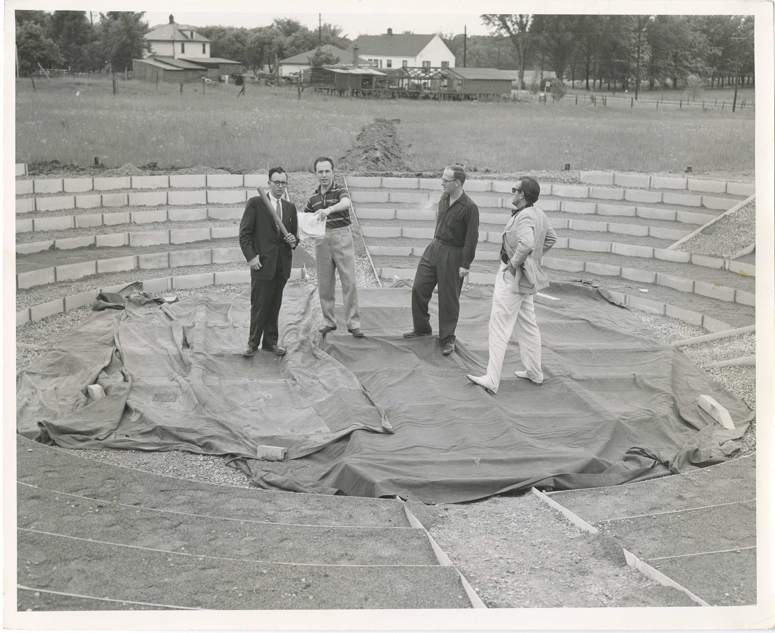 This undated, black-and-white photo shows four people standing at the base of the amphitheater that formed the Playhouse on the Green (POG). It was likely taken circa 1955-57. The tent for the theater has not been installed, and visible in the background are the fields, homes and structures that were located near the theater. The four people pictured are identified by handwriting on the back of the photo as (left to right): Joseph Weaver, manager (wearing a suit and tie and standing at the far left); Edward Ludlum, director; Jay South, sonic director. A fourth person, standing on the far right and facing away from the camera, is not identified, though is possibly actor Joel Thomas. Ludlum is shown indicating the location of something, holding up a stack of papers as if pointing towards it.
