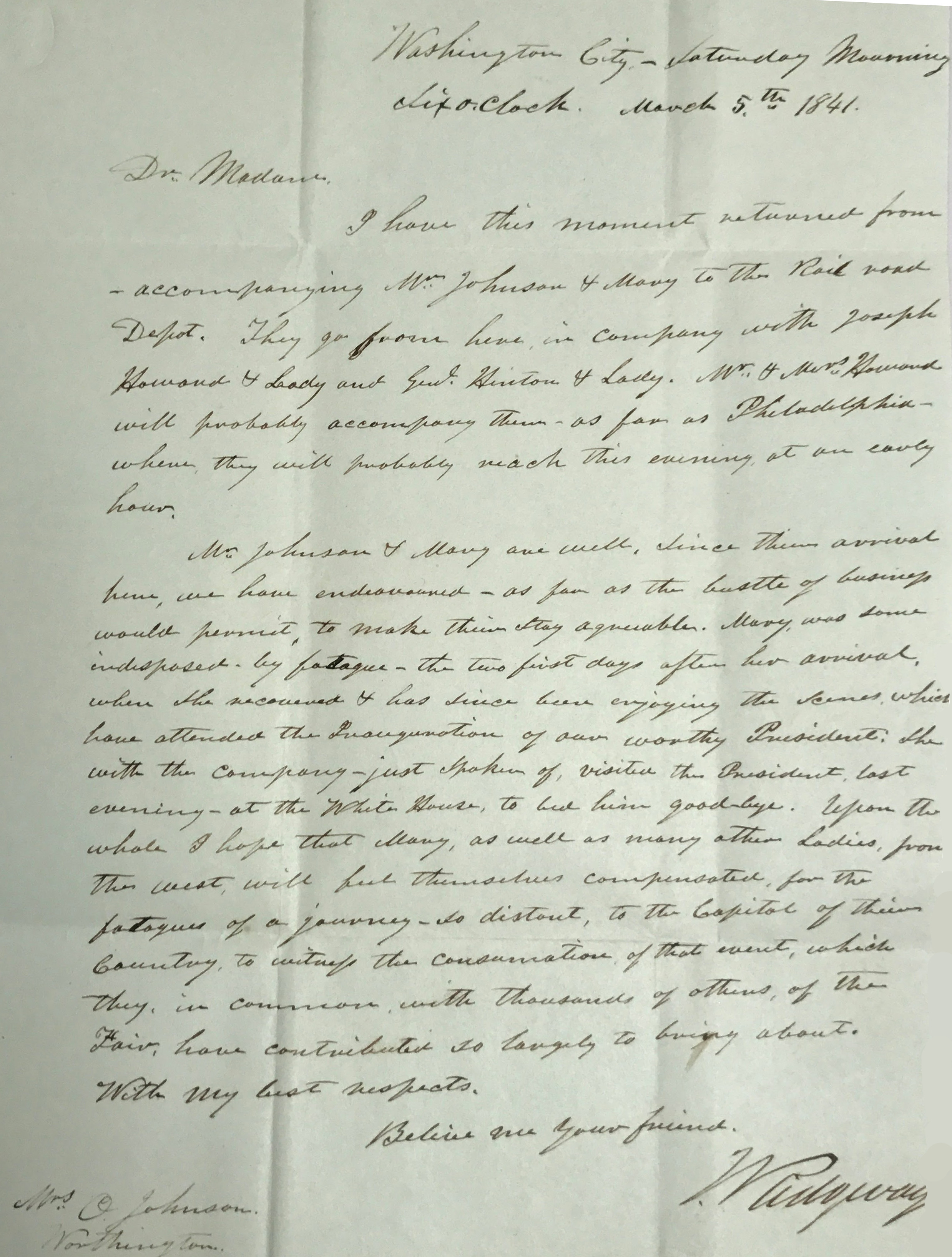 This letter was written to Achsa Johnson, wife of Orange Johnson, in Worthington, Ohio from Congressman Joseph Ridgway in Washington D.C. (Washington City). In the letter, he reports that he has just left Orange and their daughter, Mary Johnson, as they make their way from Washington D.C. where they were attending the inauguration of President Harrison to Philadelphia. He goes on to say that for the first two days in Washington D.C., Mary was a bit unwell with fatigue but hopes that she recovered and that she and "other Ladies" enjoyed the festivities.