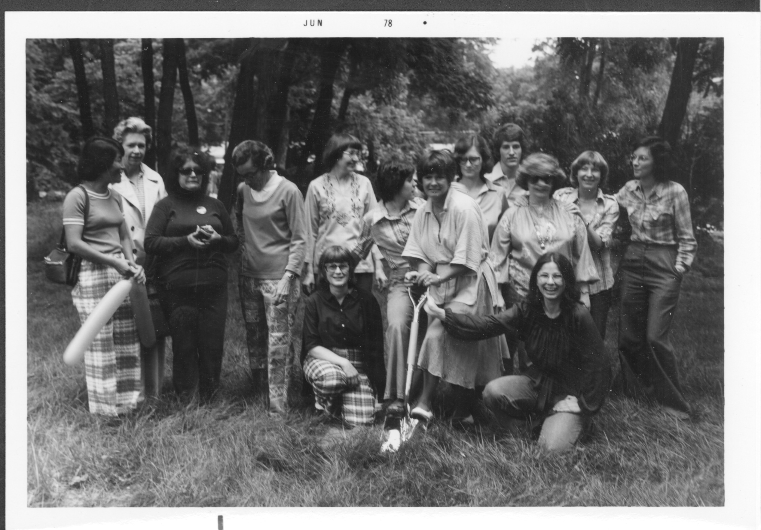 Worthington Public Library staff are pictured at the location of the new library building at 805 Hartford St. prior to the groundbreaking ceremony in the summer of 1978. They are identified as (standing left to right); Young Sook Lim, Alma Olafsson, Nancy Behling, Jean Ogg, Nancy Easterday, ?, Holly (Furney) Blake, ?, Katherine Haines, Shirley ?, (kneeling left to right) Eileen Kobee, Bernice Daniels (director, holding the shovel), and Rachel Alexander. Daniels served as director from 1967 to 1991.