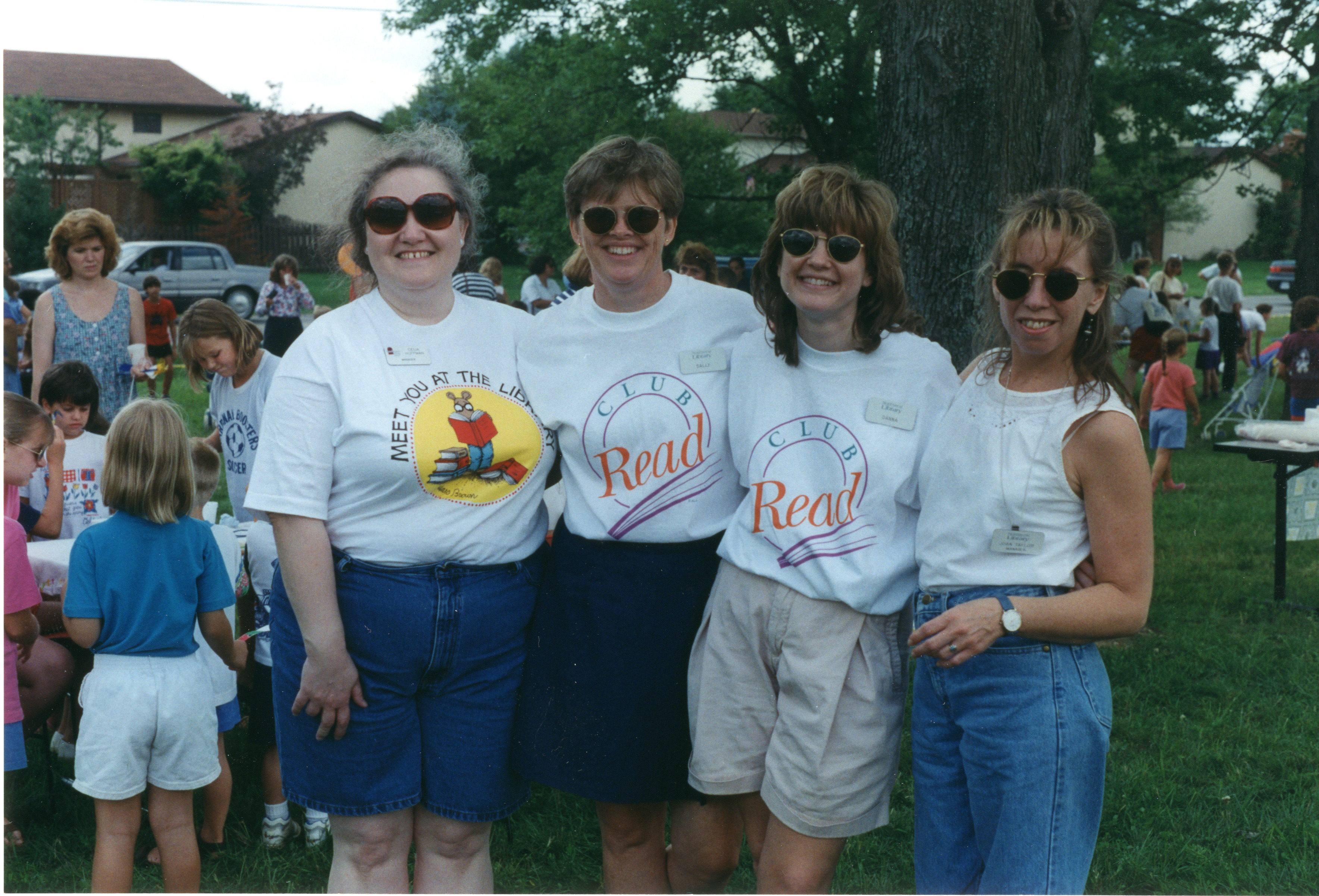 Library staff members are shown here during an outdoor party held at the Northwest Library in its first year of being open. From left to right are Celia Huffman, Sally Carton, Danna Armstrong and Joan Taylor. A celebration of the library’s summer reading program, the event featured face-painting, games, and a performance by ventriloquist Rick Evans.