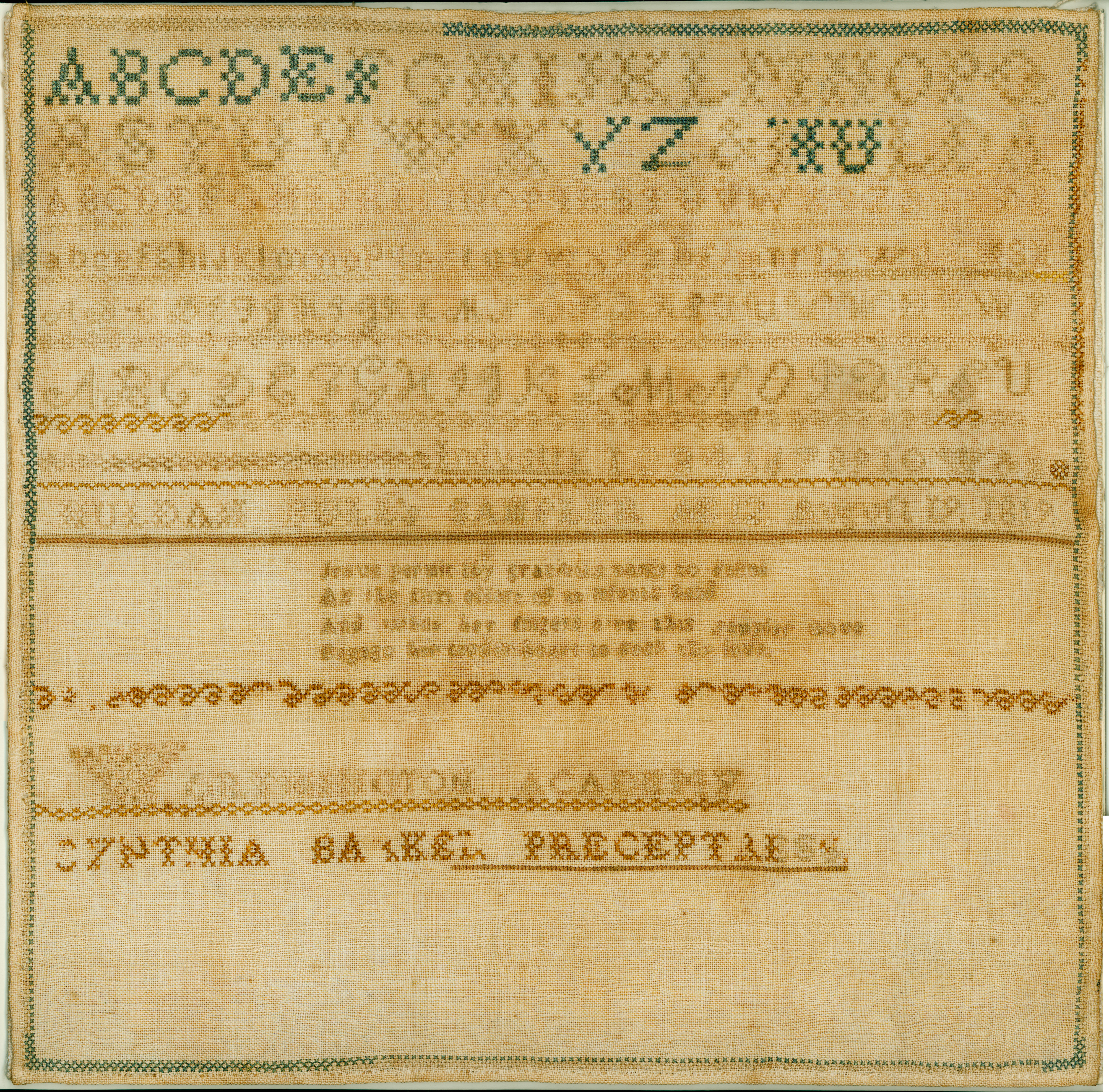 This sampler is done in cross-stitch using cotton floss of different colors, five embroidered alphabets and a religious verse. Cynthia Barker was preceptress at the time.