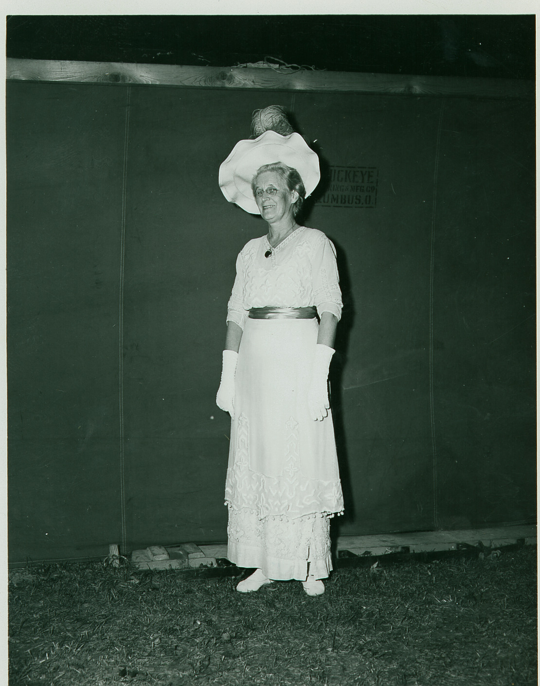Marie Pingree Moore Harrison (b. 1887 d. 1985) was one of over community members who played a role in Worthington's sesquicentennial pageant. She is pictured here in costume at the performance site.