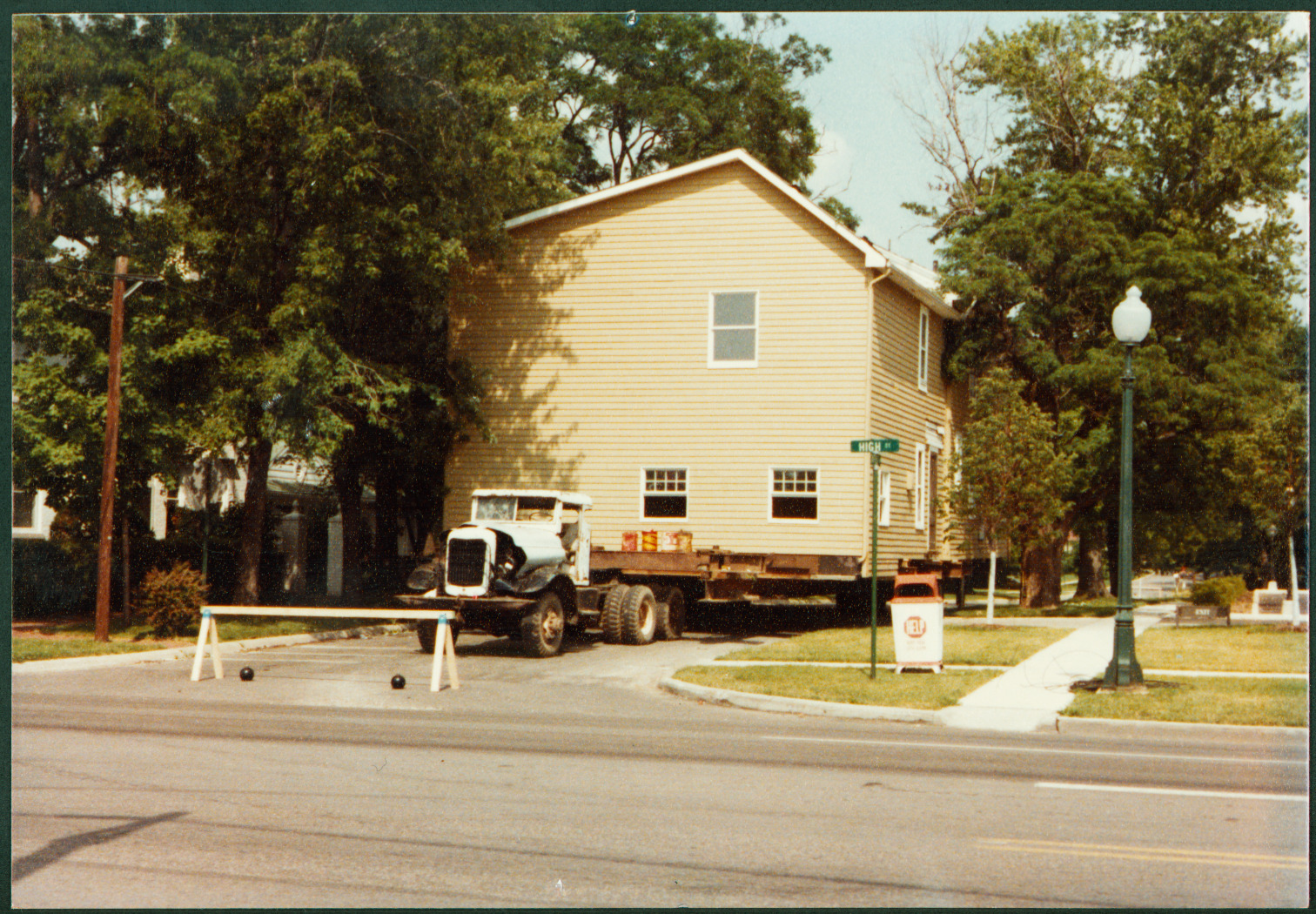 The historic building known as the Old Rectory was moved from 799 Hartford Street to its present location at 50 West New England Avenue during the first week of July, 1978. It was purchased by the Worthington Historical Society in March to serve as offices, gift shop and exhibit space. The structure is pictured on a flatbed truck on East Stafford Avenue at the corner of North High Street where it sat throughout the day before heading down High Street towards New England Avenue at about 1:00 A.M. July 7.