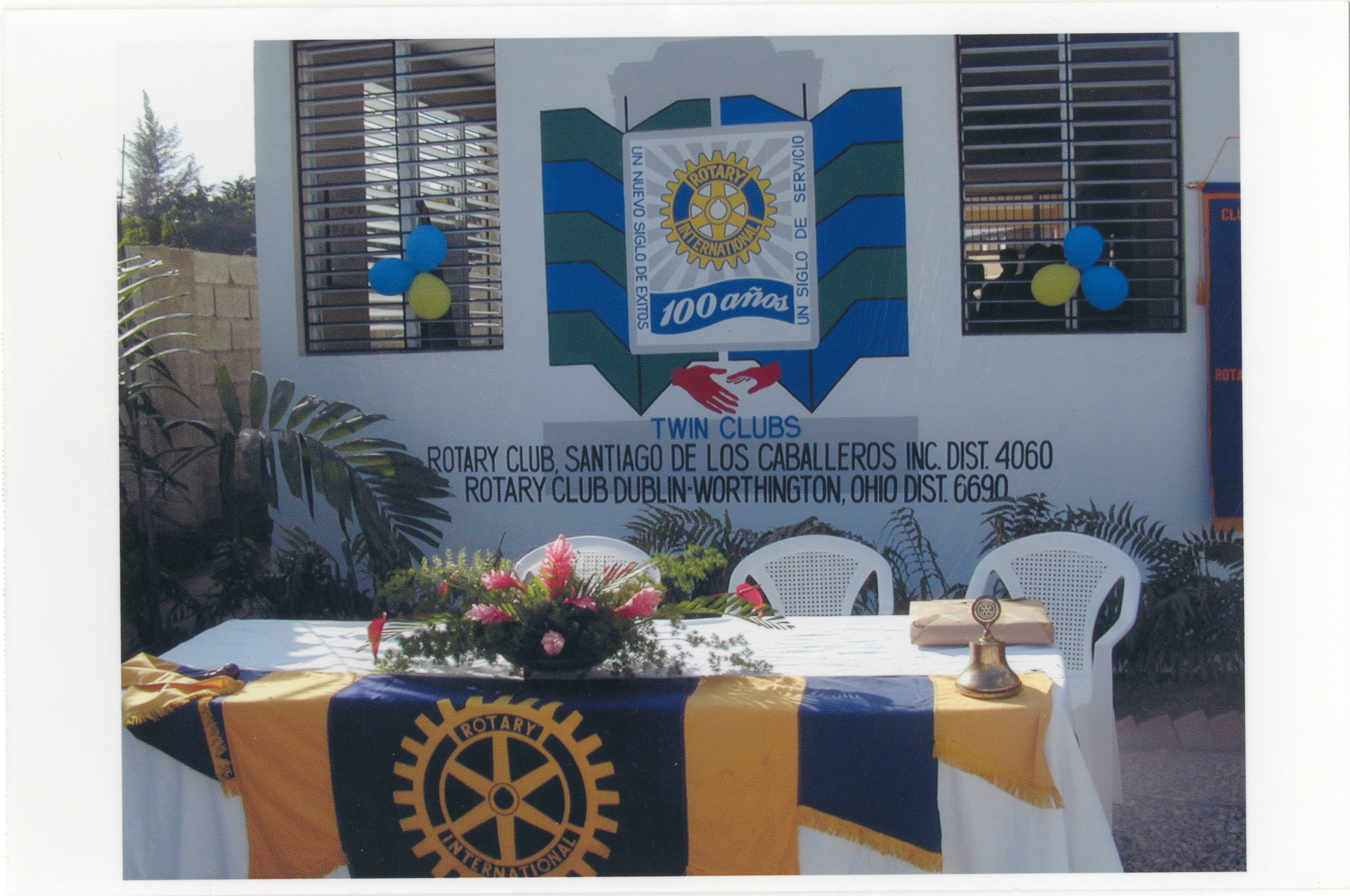 Soon after the official proclamation to become Twin Clubs, the Dublin-Worthington Rotary Club began discussing ways to help the Rotary Club Santiago de los Caballeros, Inc. with their construction of a new medical clinic in Barrio Lindo, Santiago de los Caballeros, Dominican Republic. The DWRC ultimately provided partial financial support, and a group of volunteers consisting of Rotarians and local high school students travelled to the Dominican Republic to help paint the new building. This photograph shows the finished clinic.