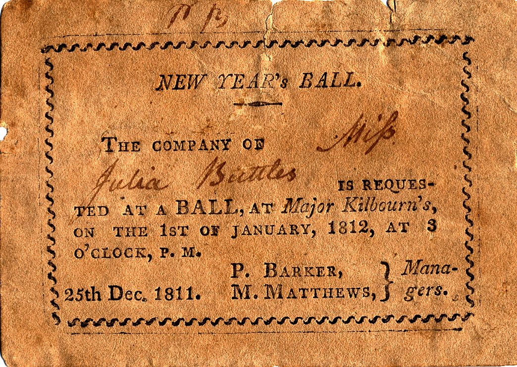 This invitation requests the presence of Julia Buttles (b. 1795, d. 1852) at a new year's ball hosted by Major James Kilbourn (b. 1770, d. 1850), founder of the Scioto Company. Julia was one of seven children born to Levi Buttles (b. 1763, d. 1805) and Sarah Phelps Buttles (b. 1764, d. 1844). She married Job Warren Case (b. 1787, d. 1843) in 1815. Managers of the event identified on the invitation were Peter Barker (b. 1790, d. 1863), a carpenter by trade and Matthew Mathews (b. 1790, d. 1842) a merchant and son in law of James Kilbourn.