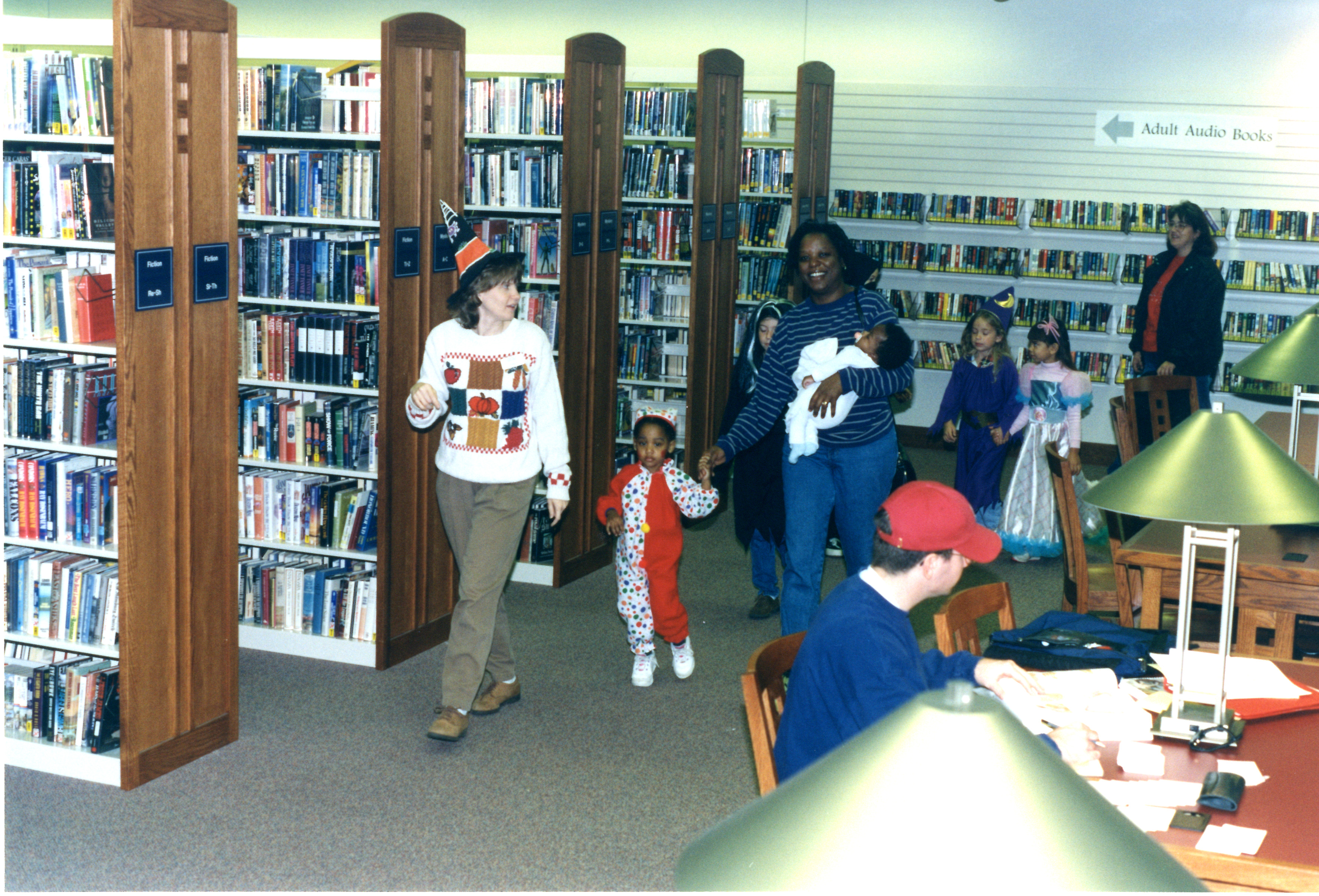 Attendees at the Northwest Library’s first Pumpkin Parade are shown here. The Pumpkin Parade is an annual fall storytime, after which attendees get to walk around the library to show off their Halloween costumes. Leading the parade is Worthington Libraries staff member Danna Armstrong. This was the first Pumpkin Parade storytime held at the Northwest Library since its opening in April 1996.