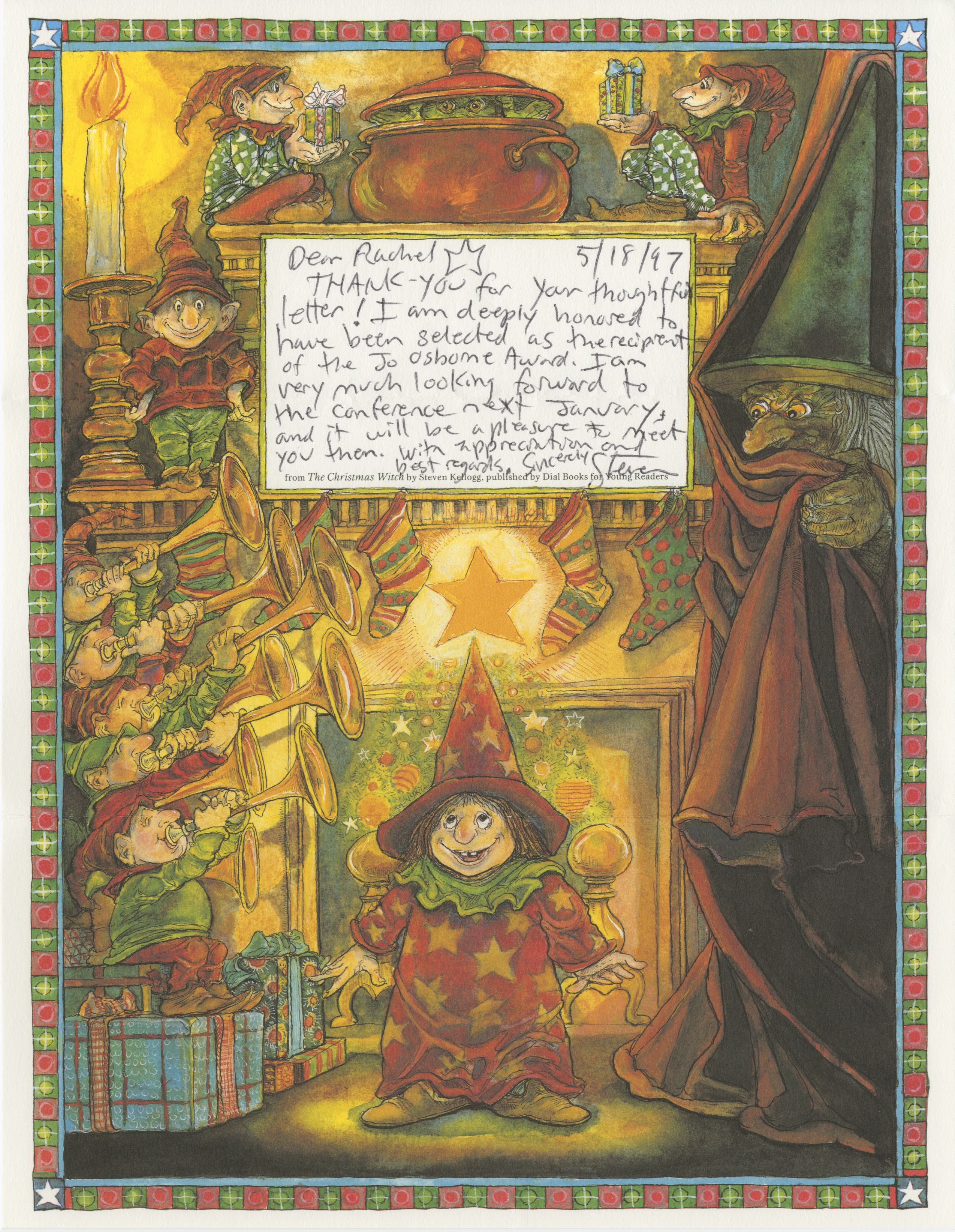 Shown here is a copy of a note sent from author and illustrator Steven Kellogg to Rachel Alexander, thanking her for her letter announcing his win of the Jo Osborne Award for Humor in Children's Literature for 1998. The note is handwritten on stationery decorated with Kellogg's illustrations.