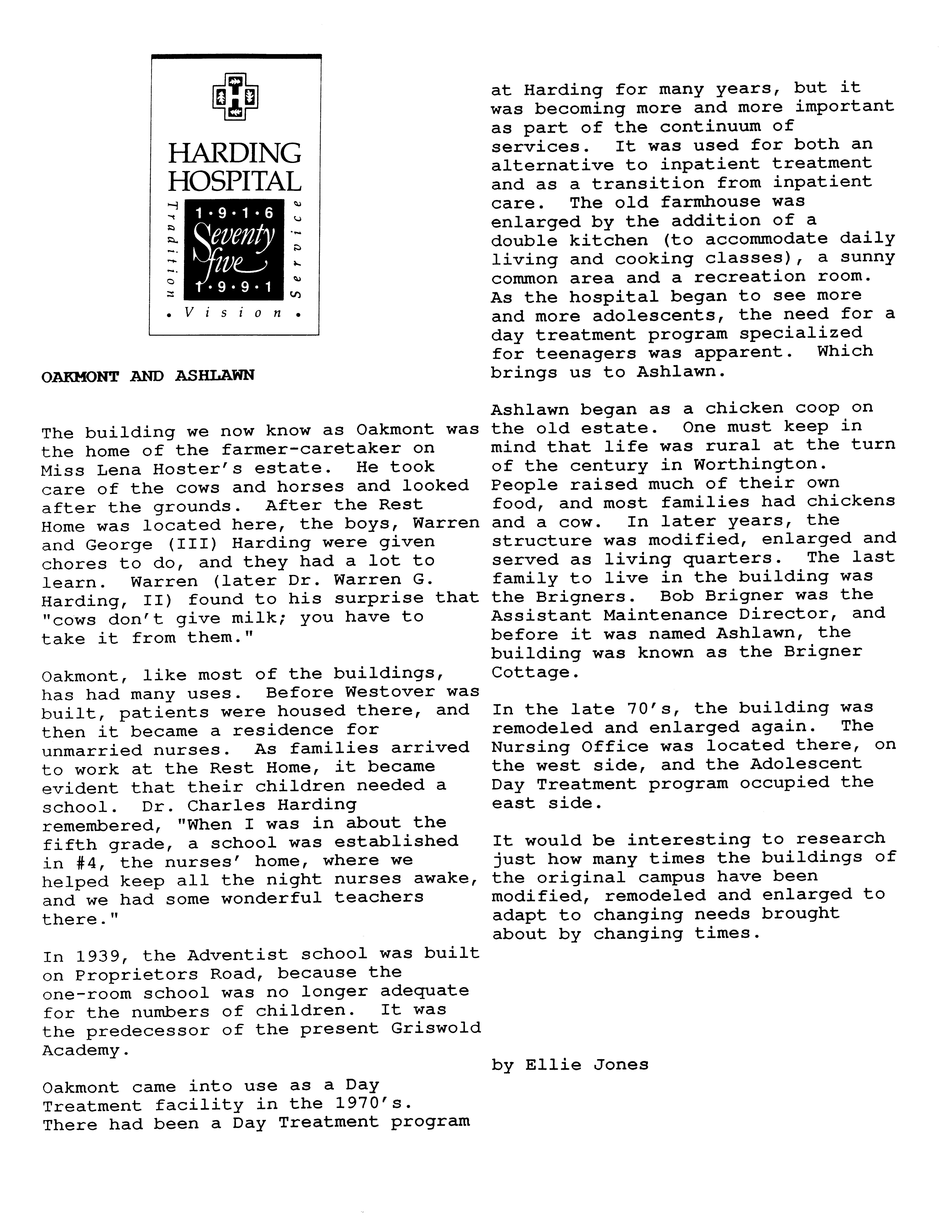 This is one in a series of articles on the history of Harding Hospital. Included in the newsletter distributed to hospital employees, the articles were written by Ellie Jones, Harding Hospital archivist. This article focuses on two of the buildings on the hospital campus that were known as Oakmont and Ashlawn. Oakmont served as a residence hall, a school and a day treatment program facility. Ashlawn began as a chicken coop, then was remodeled into a residence cottage and later a nursing office and day treatment program facility.