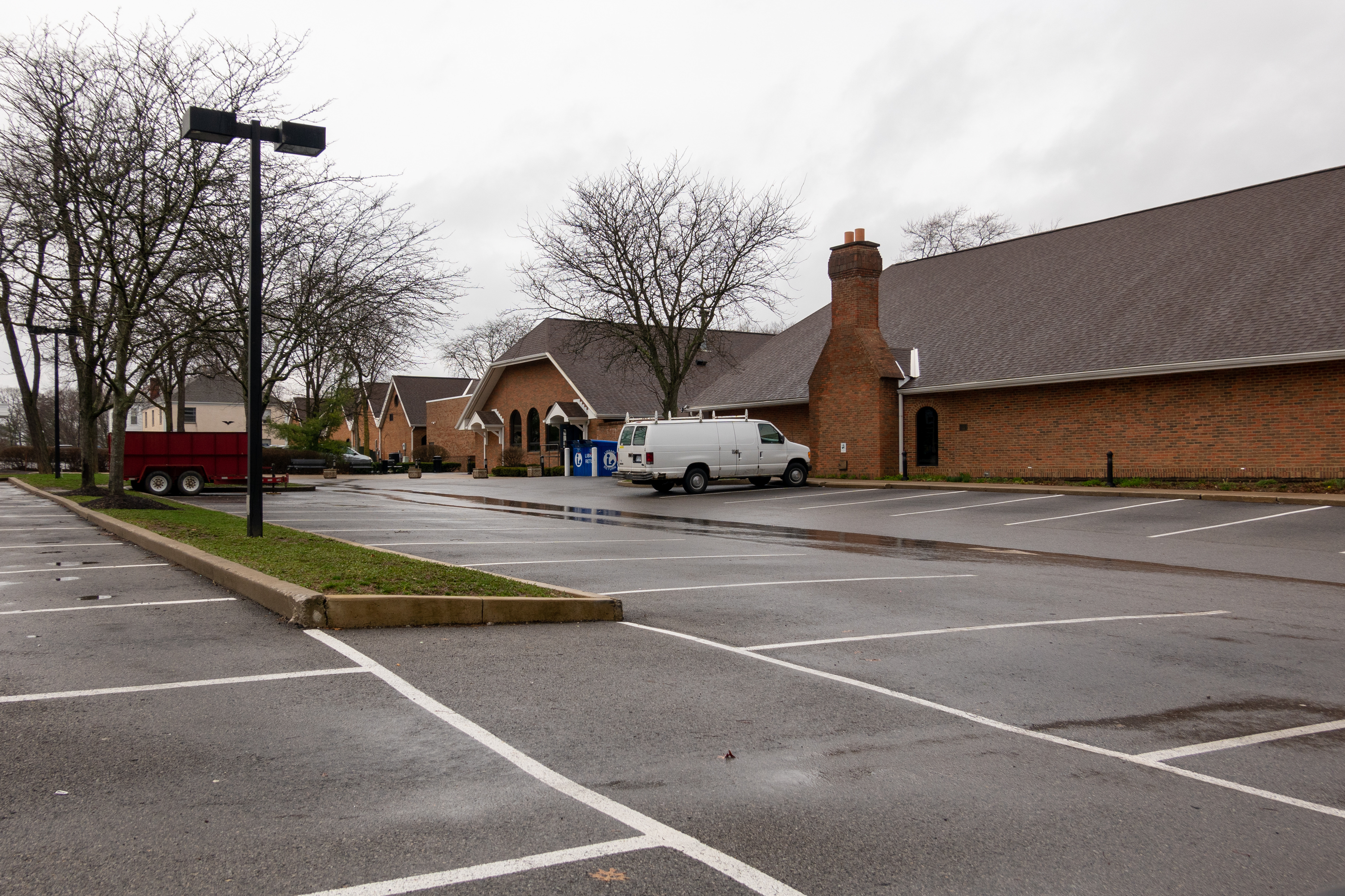 This photograph shows the south parking lot of the Old Worthington Library on March 20, 2020. The scene was unusually empty of vehicles and people: Worthington Libraries temporary closed all three of its library buildings to the public at 6pm on Friday, March 13, 2020, to help mitigate the spread of COVID-19. When announced, the closure was projected to last “until at least Sunday, April 5” but it ultimately lasted until June 5, 2020, when the library began accepting returns of checked-out materials.