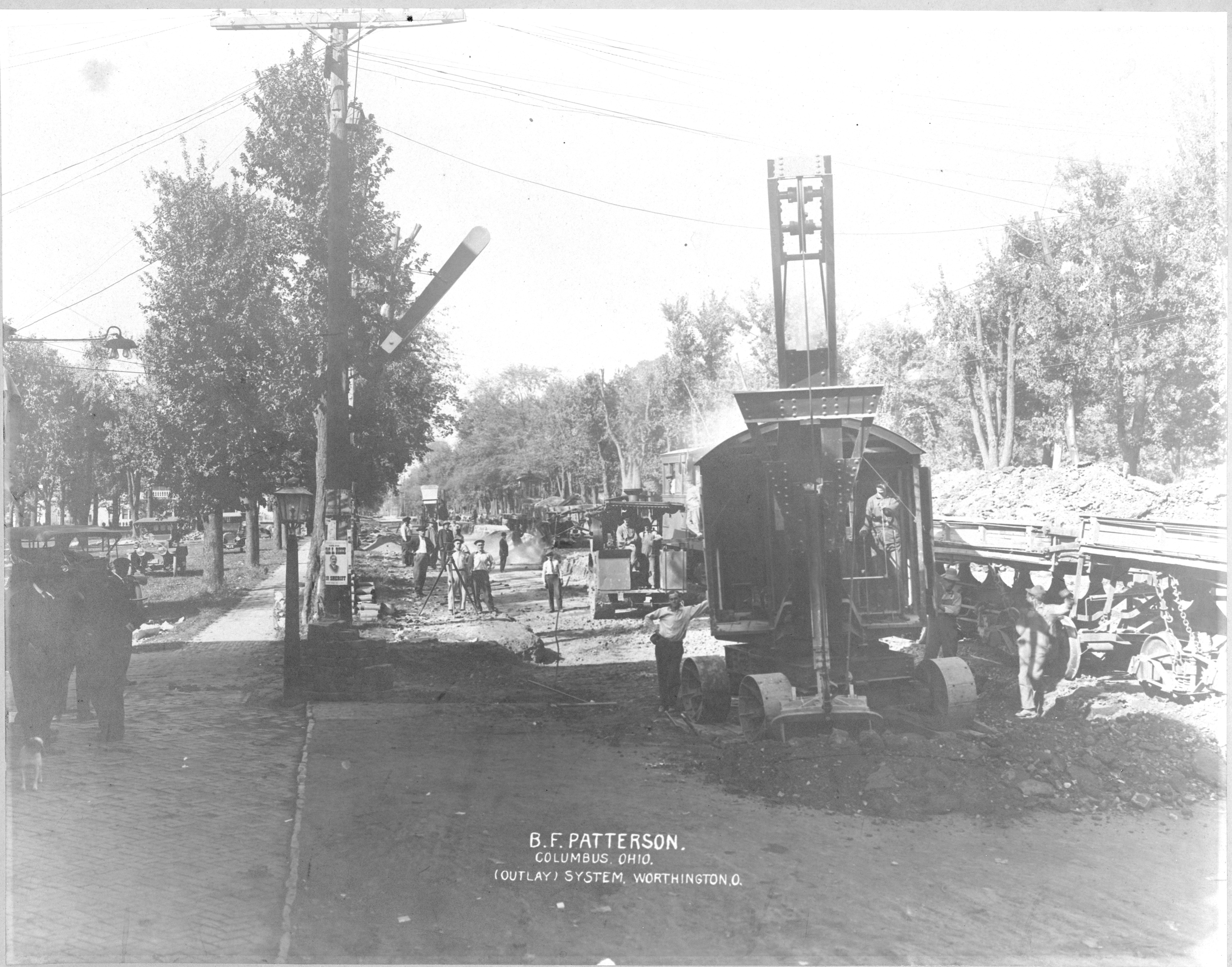 This image shows Columbus contractor B. F. Patterson laying the sewer system in Worthington, Ohio ca. 1920. This view is looking north on High Street from the intersection of Dublin Granville Road. A sewer system for the Village was first proposed in City Council in 1903, accompanied by a plan for a waterworks. Worthington, like many rural towns in Ohio on the outskirts of a growing metropolis, was struggling with the issues of growth and change. The interurban railroad had brought new homeowners to the town, and the population was growing. The sewer and water works would signal a fundamental change that would alter the nature of the town. Taxpayers would pay for the systems with increased property taxes. There was resistance to the plans. The water works were not installed until 1908, while the plans for the sewer system were presented to the public in 1919. Worthington was on the way to become a modern suburb.
