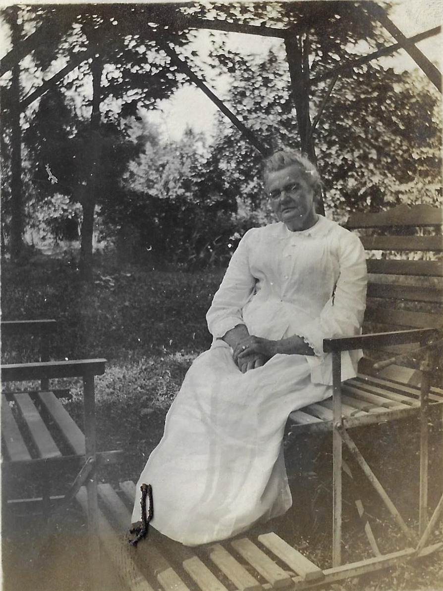 Fondelia Ruth Griswold (b. 1843, d. 1930), is photographed here around age 72. The widow of Worthington Franklin Griswold resided at the Grsiwold Inn located just north of the northeast quadrant of the Village Green on High Street from the time of her marriage until she passed away. Several of her daughters lived in the vicinity, including Ruth, who lived at the Griswold Inn almost her entire life. This image is from a scrapbook that belonged to daughter Harriet Griswold McCullough.