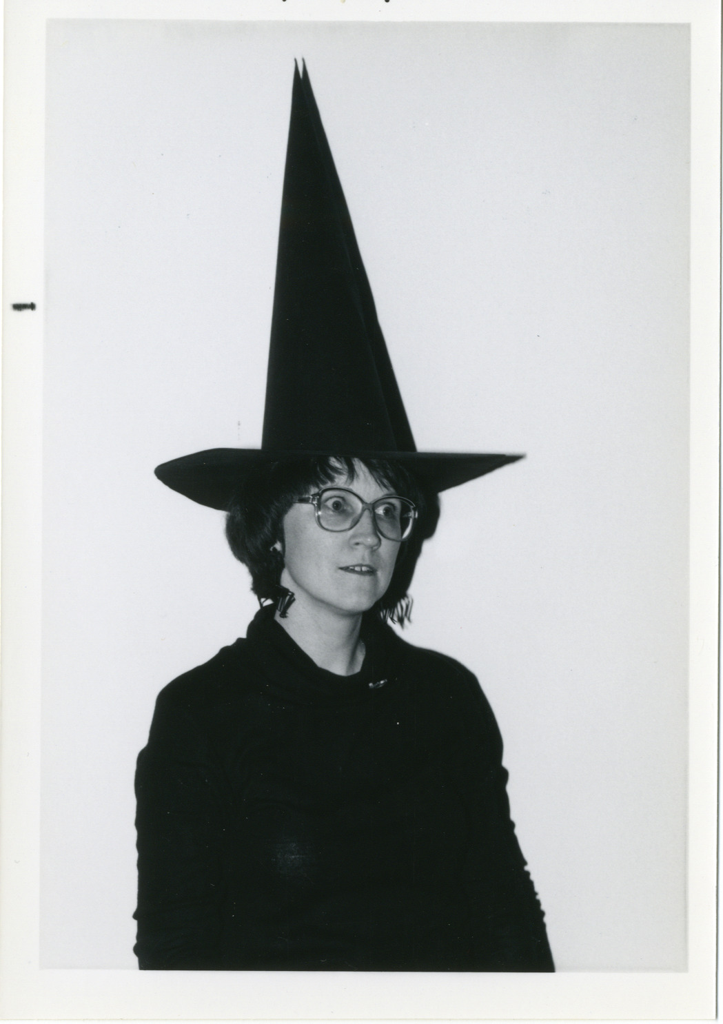Photograph of Librarian Jo Osborne in a Witch's Hat