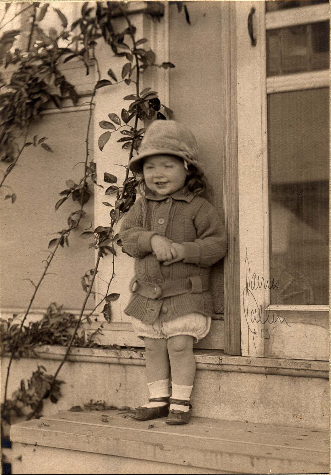 This photograph shows Marie (Molly) Brown (later Molly Brown Caren Fisher) at age two. She is pictured standing on a porch next to the door, clasping her hands while looking down and smiling. Handwritten next to her is a name that might read "James Callin" and the numbers "15," presumably in reference to the year 1915, when the photo was taken.