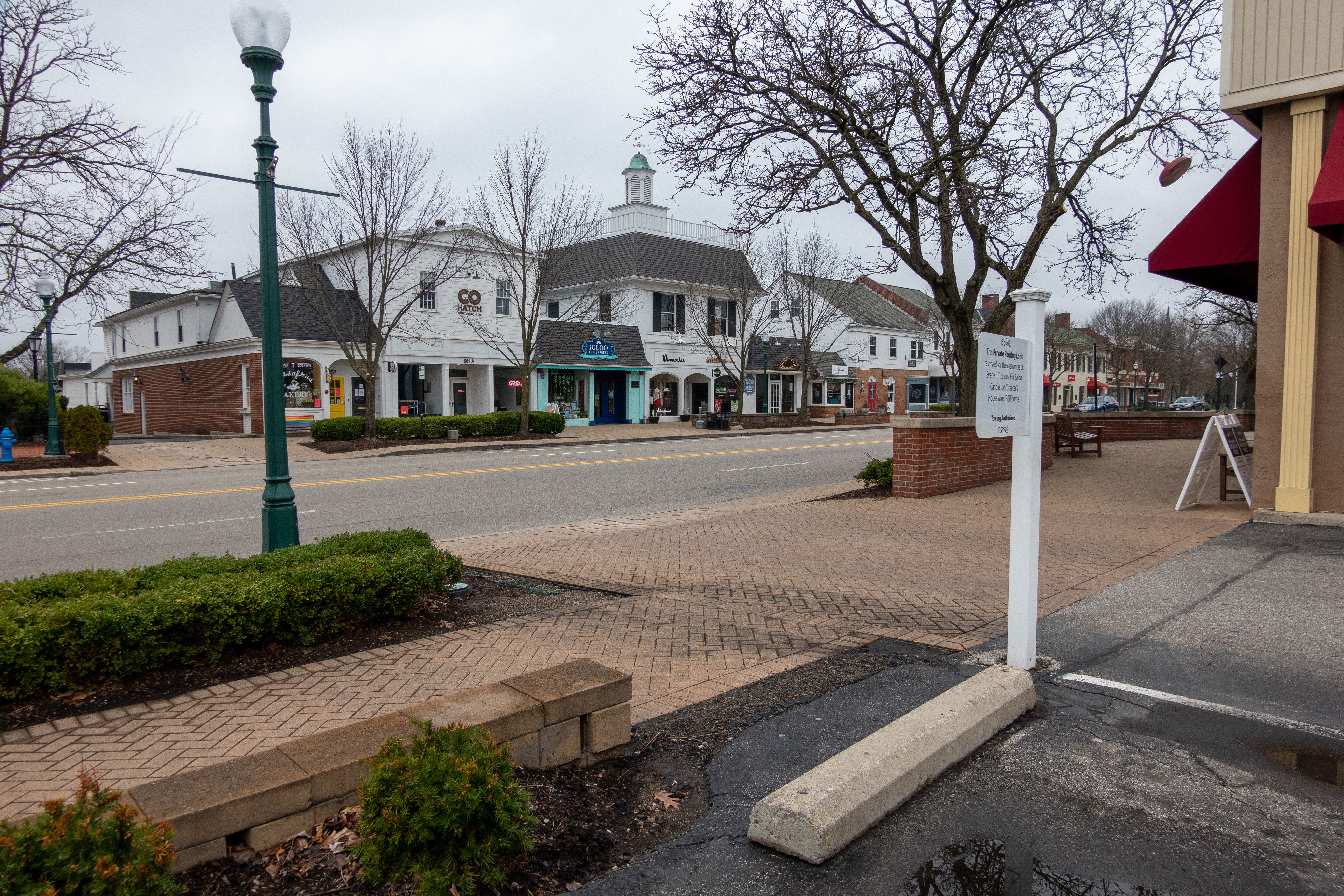 This photograph shows an unusual abundance of street parking – and absence of pedestrians – near the intersection of High Street and New England Avenue, facing north, in Old Worthington on March 27, 2020. Worthington’s normally busy streets and public places were quiet during the spring of 2020 due to Ohio’s historic stay at home order to combat the COVID-19 pandemic. Issued by Governor Mike DeWine, Lt. Governor Jon Husted and Ohio Department of Health Director Amy Acton M.D. MPH, the order went into effect on Monday, March 23, 2020 at 11:59 pm. The order closed nonessential businesses, restricted gatherings, ordered all residents to stay in their homes except for certain exempt activities, and limited travel. The order was fully lifted on May 19, replaced by strong recommendations for social distancing.