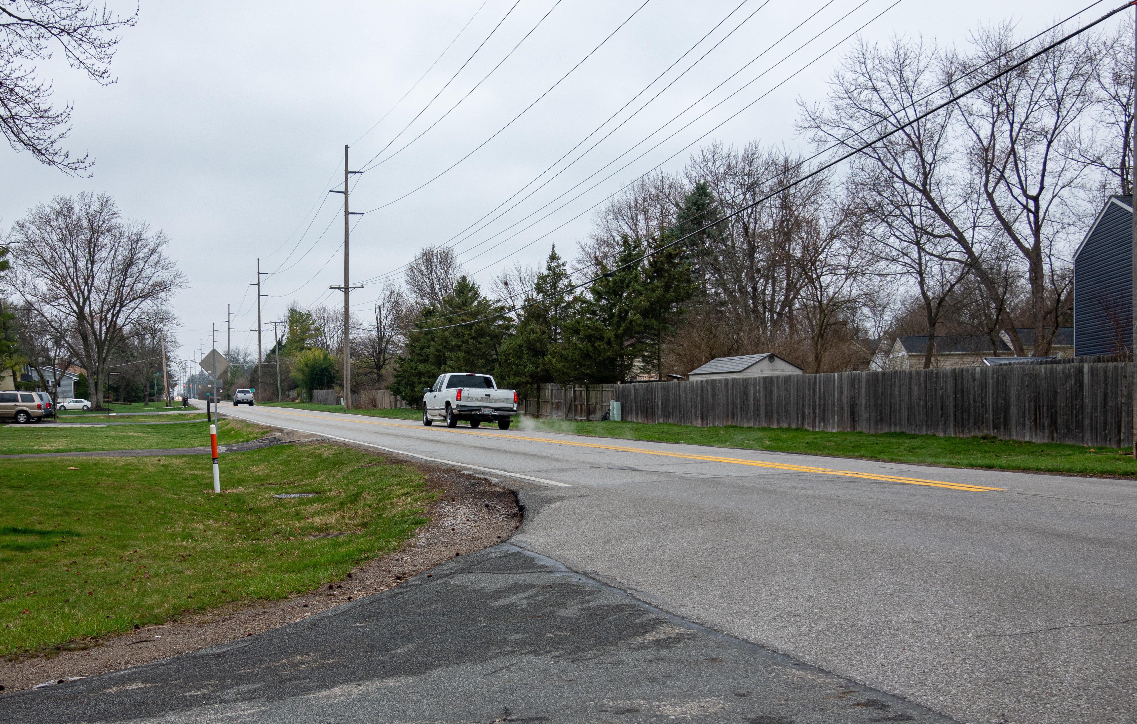 This photograph shows Snouffer Road west of Linworth, looking west. Only two cars are visible; the road typically has much heavier traffic than is pictured.