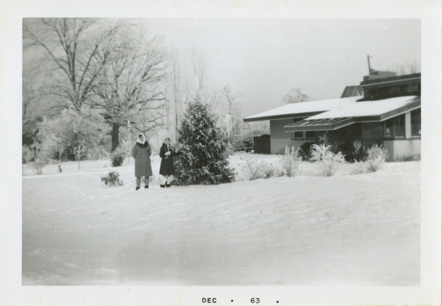 This black and white photographs shows two unidentified people standing on the snow-covered lawn beside 312 E. South Street. They are dressed in winter coats and face the photographer.