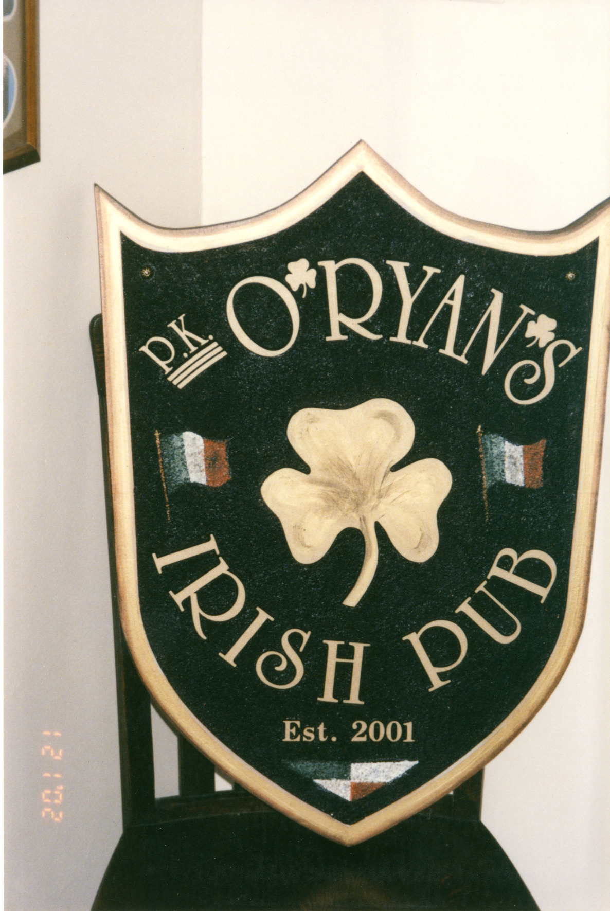 Shown here is a sign for P.K. O'Ryan's Irish Pub, which was located at 666 High Street. The pub operated from 2001 to 2014. The sign is displayed on a chair. It's in the shape of a shield, and displays the words "P.K. O'Ryan's Irish Pub Est. 2001," along with a large gold-colored shamrock flanked by two Irish flags. The sign was designed by artist and signmaker William (bc) (Bill) Collins.